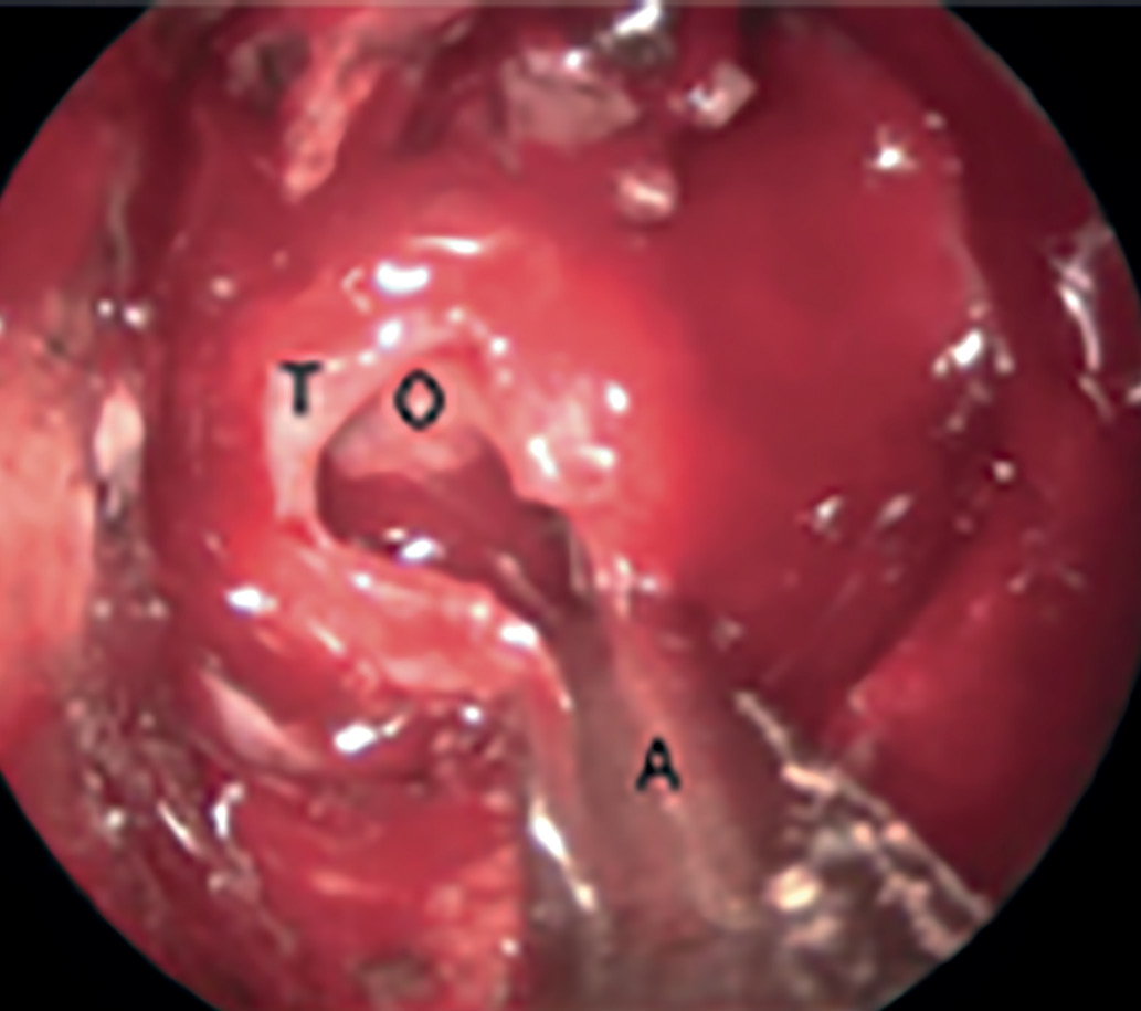 4. Рисунок 4. Процесс удаления опухоли из полости турецкого седла при помощи аспиратора (Т — твердая мозговая оболочка, О — опухоль, А — аспиратор).