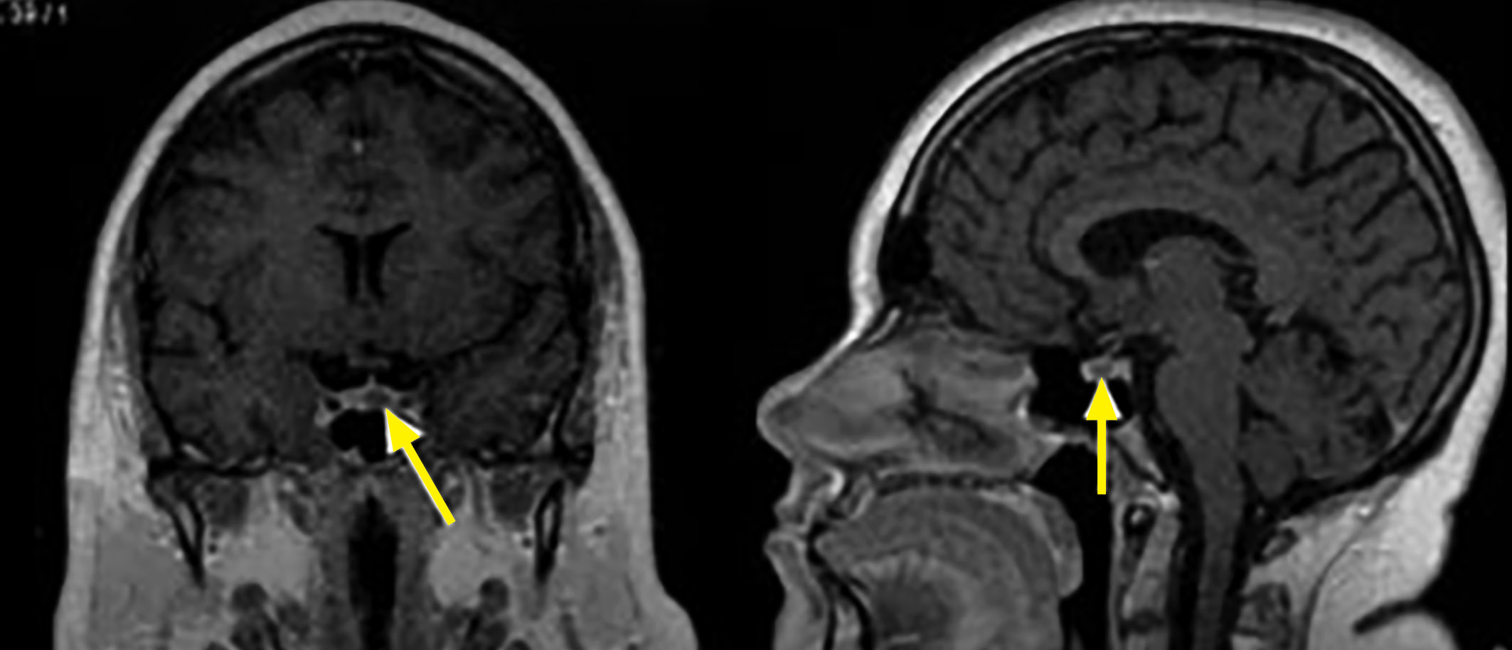 Рисунок 7. Эндоселлярная кортикотропинома. На фронтальных (А) и сагиттальных (Б) МР-томограммах в Т1-взвешенном режиме при введении контрастного вещества отмечается сниженное накопление контрастного вещества, в отличие от нормальной ткани гипофиза.