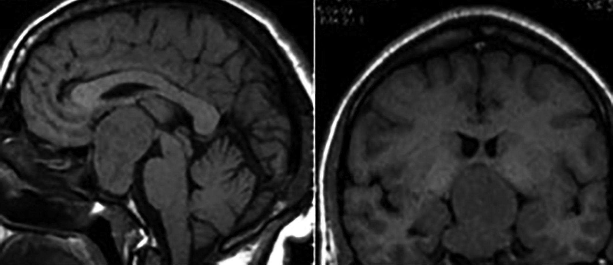 Рисунок 8. Эндо-супраселлярная соматотропинома. На сагиттальных (А) и фронтальных (Б) МР-томограммах в Т1-взвешенном режиме выявляется гипоинтенсивная опухоль.