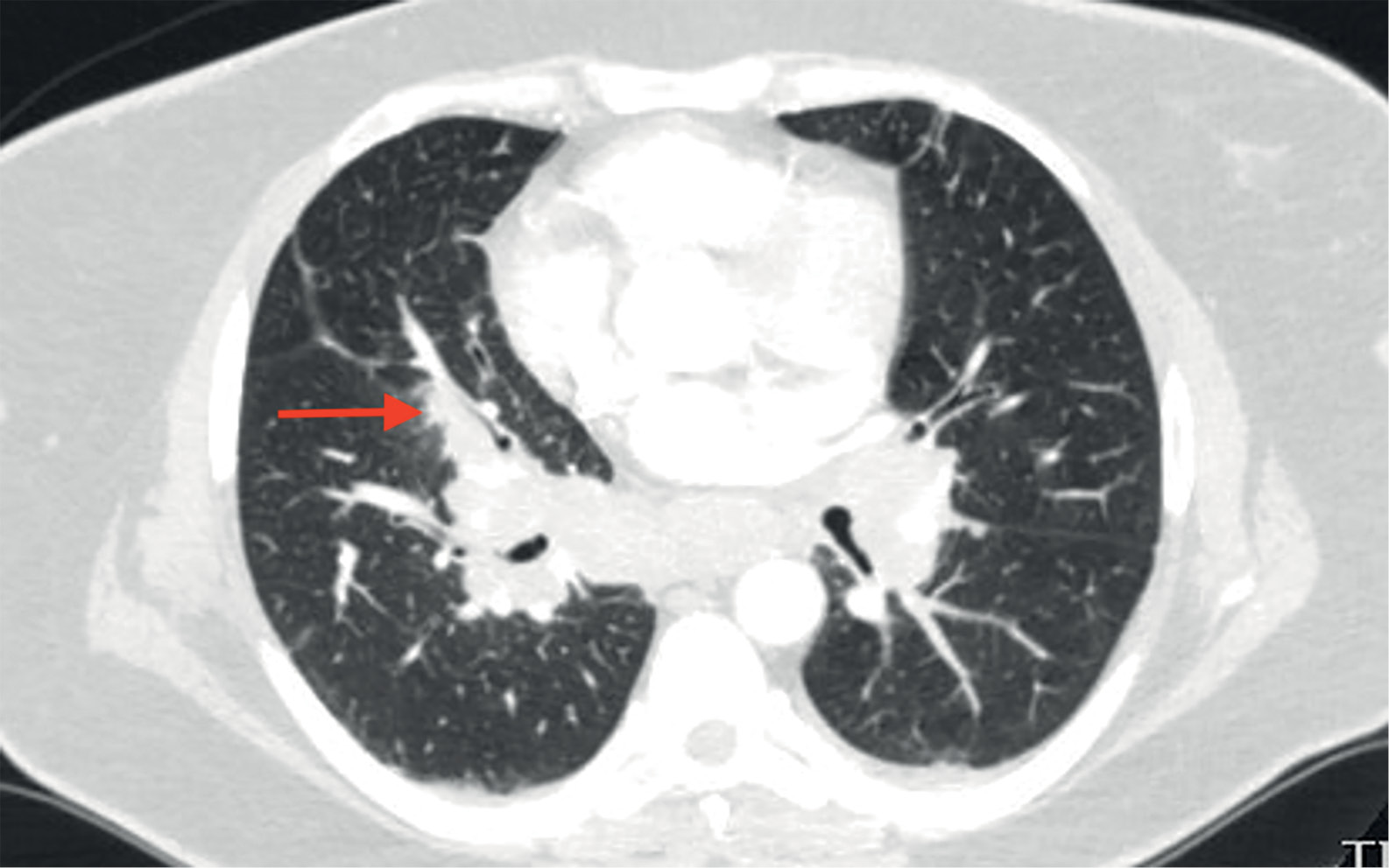 2. Рисунок 2. Саркоидоз легких и внутригрудных лимфоузлов у пациентки М. Невыраженное уплотнение перибронховаскулярного интерстиция (указано стрелкой).