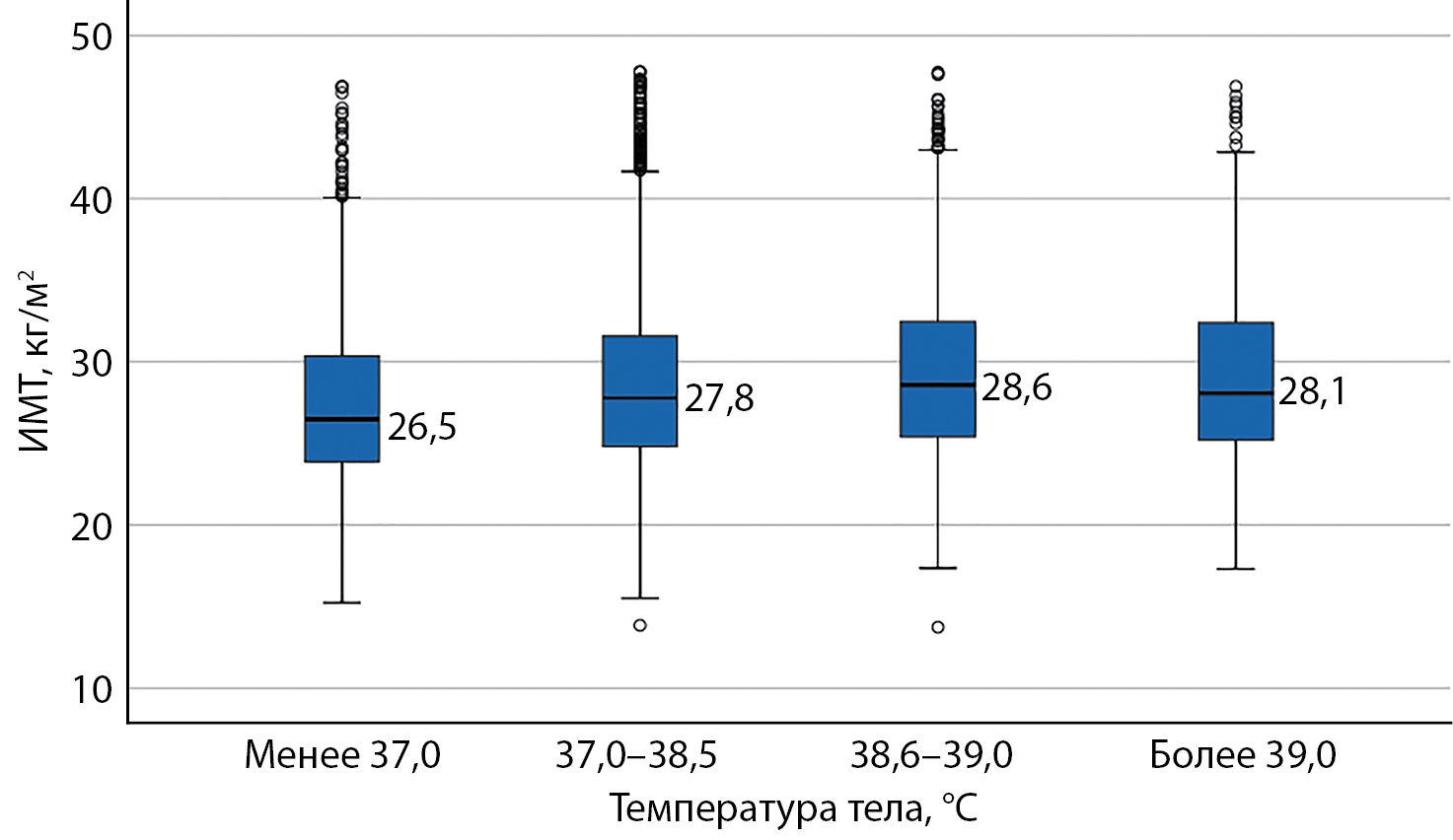 1. Рисунок 1. Показатель ИМТ у больных COVID-19 с различной температурой тела в остром инфекционном периоде. Примечание: ИМТ — индекс массы тела.