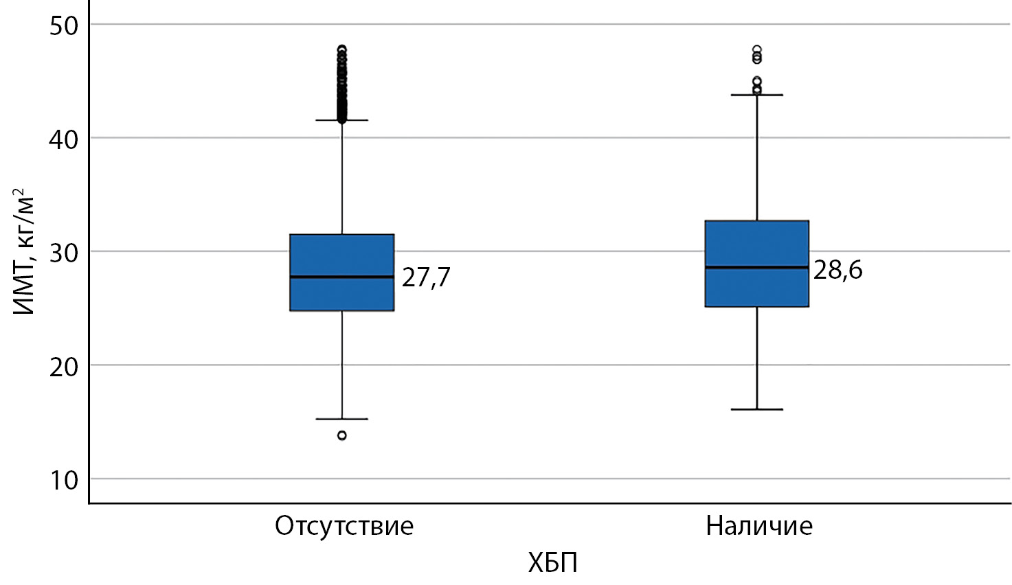 2. Рисунок 2. Показатель ИМТ у пациентов с новой коронавирусной инфекцией в зависимости от наличия ХБП в анамнезе. Примечание: ИМТ — индекс массы тела; ХБП — хроническая болезнь почек