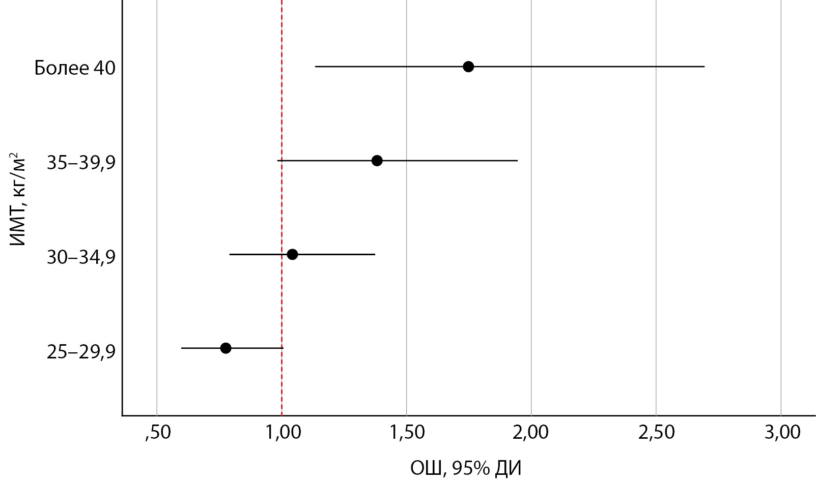 3. Рисунок 3. Шанс летального исхода у пациентов с НКИ в зависимости от показателей ИМТ в остром инфекционном периоде SARS-CoV-2.