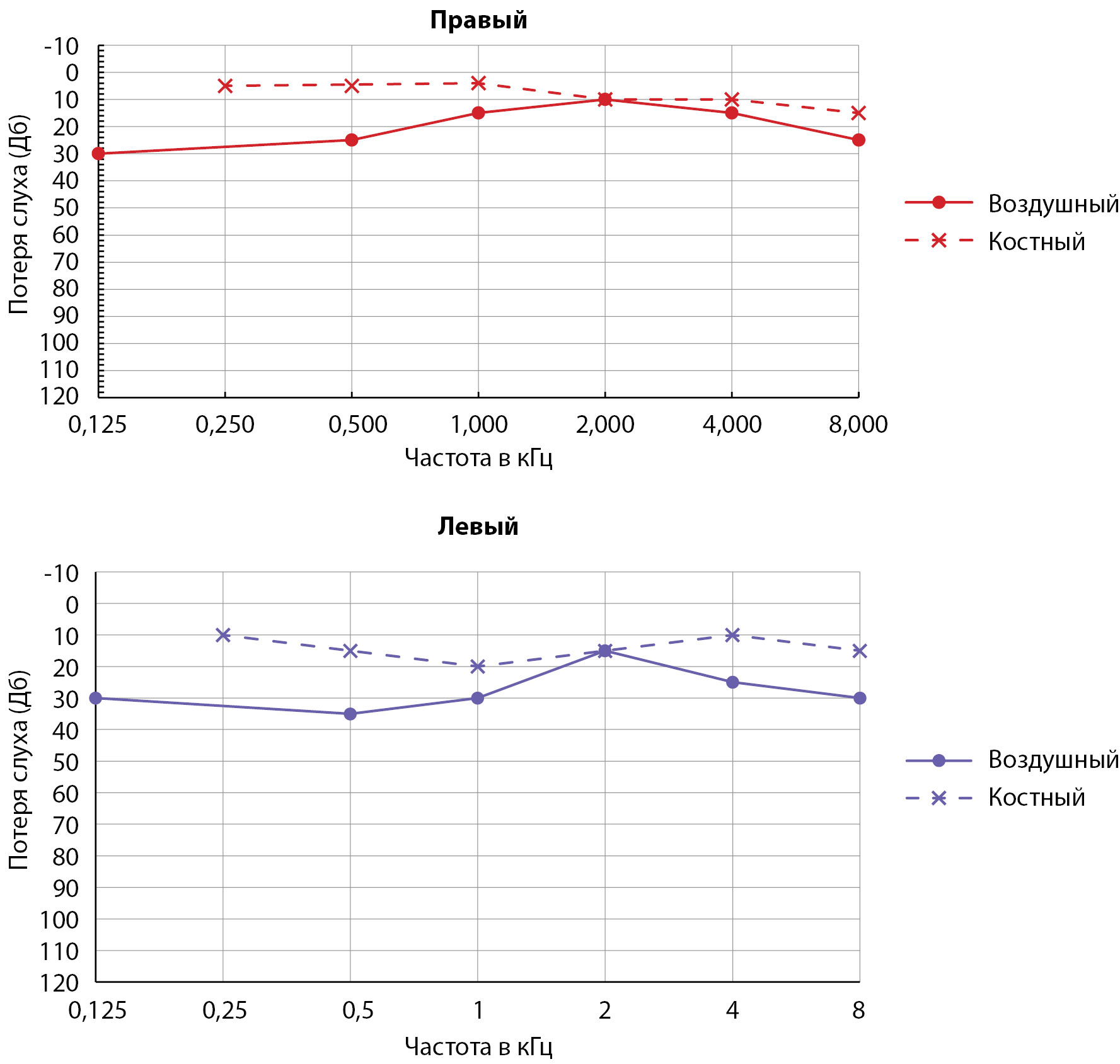 В связи с жалобами на заложенность носа и снижение слуха был проведен осмотр врачом-оториноларингологом. По результатам риноскопии отмечено сужение носовых ходов за счет искривления носовой перегородки и отечности носовых раковин с обеих сторон. Также на основании проведенной аудиометрии (рис. 1) диагностирована хроническая двусторонняя сенсоневральная тугоухость справа — III степени, слева — I степени.