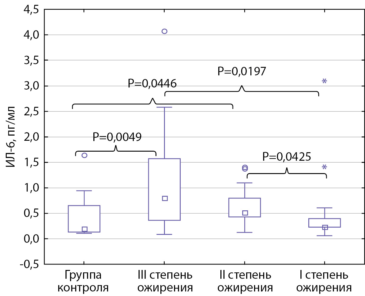 В работе D.M.E. El-Mikkawy и соавт. у взрослых пациентов (36,40±7,26 года, n=60) с ожирением и избыточной массой тела уровень ИЛ-6 был статистически значимо выше, чем у лиц с нормальным весом (р=0,0001) и положительно коррелируется с ИМТ [12]. Схожие результаты получены и в других исследованиях на взрослых пациентах [13–15].