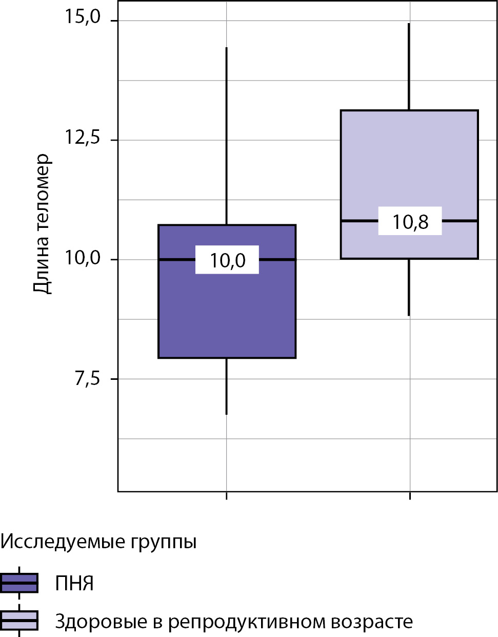 С целью более наглядного сопоставления длин теломер у исследуемой группы (ПНЯ, n=33) в качестве референсных показателей мы привели аналогичные показатели здоровых женщин репродуктивного возраста (контрольная группа, n=24). Медиана возраста в данной группе составила 36 [ 30,0–40,0] лет, ИМТ=22 [ 20,0–27,0] кг/м², ФСГ=5,85 [ 4,75–8,55] мМЕд/л, длина теломер 10,8 [ 10,0–13,1] кБ.