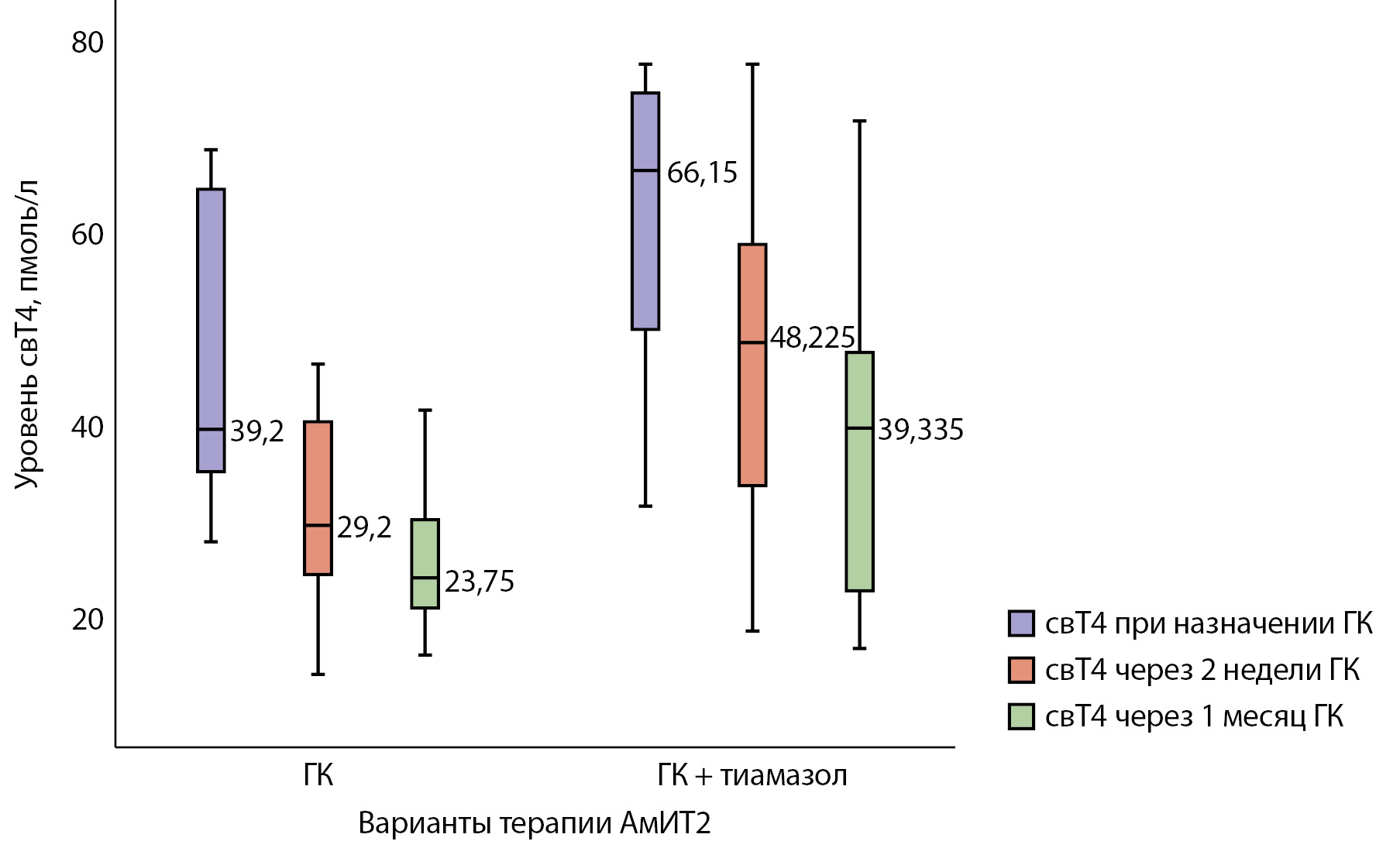 Выбор стартовой дозы ГК был обусловлен уровнем свТ4: большая — при умеренном и тяжелом течении АмИТ2. Средняя доза преднизолона 0,5 мг/кг (30–40 мг/сут), а также медиана времени достижения эутиреоза (32 [ 15,0; 45,5] дня) сопоставимы с результатами итальянских (28–40 дней) [20][22][24] и австралийских коллег (32–35 дней) [28]. На фоне терапии преднизолоном отмечалось статистически значимое снижение уровня свТ4 в обеих группах.