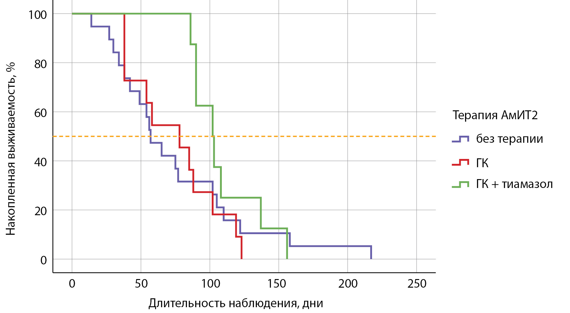 Проведено ретроспективное исследование, включившее 38 пациентов с АмИТ2 (20 мужчин и 18 женщин). В зависимости от варианта медикаментозной терапии сформированы 3 группы пациентов: без терапии (n=19), получавшие ГК (n=11) или комбинацию ГК и тиреостатиков (n=8). Срок наблюдения составил 6–18 мес, включая период лечения. Прием ГК в стартовой дозе, эквивалентной преднизолону 30 [ 30; 40] мг/сут, продолжался до нормализации уровней свободных фракций тиреоидных гормонов, в дальнейшем осуществлялось снижение дозы на 5 мг каждые 7–10 дней до полной отмены. Продолжительность приема ГК составила 82 [ 71; 104] дня. Тиамазол назначался в дозе 30 [ 30; 40] мг/сут, длительность терапии составила 30 [ 24; 60] дней. У 7/8 человек прием тиамазола предшествовал назначению ГК.