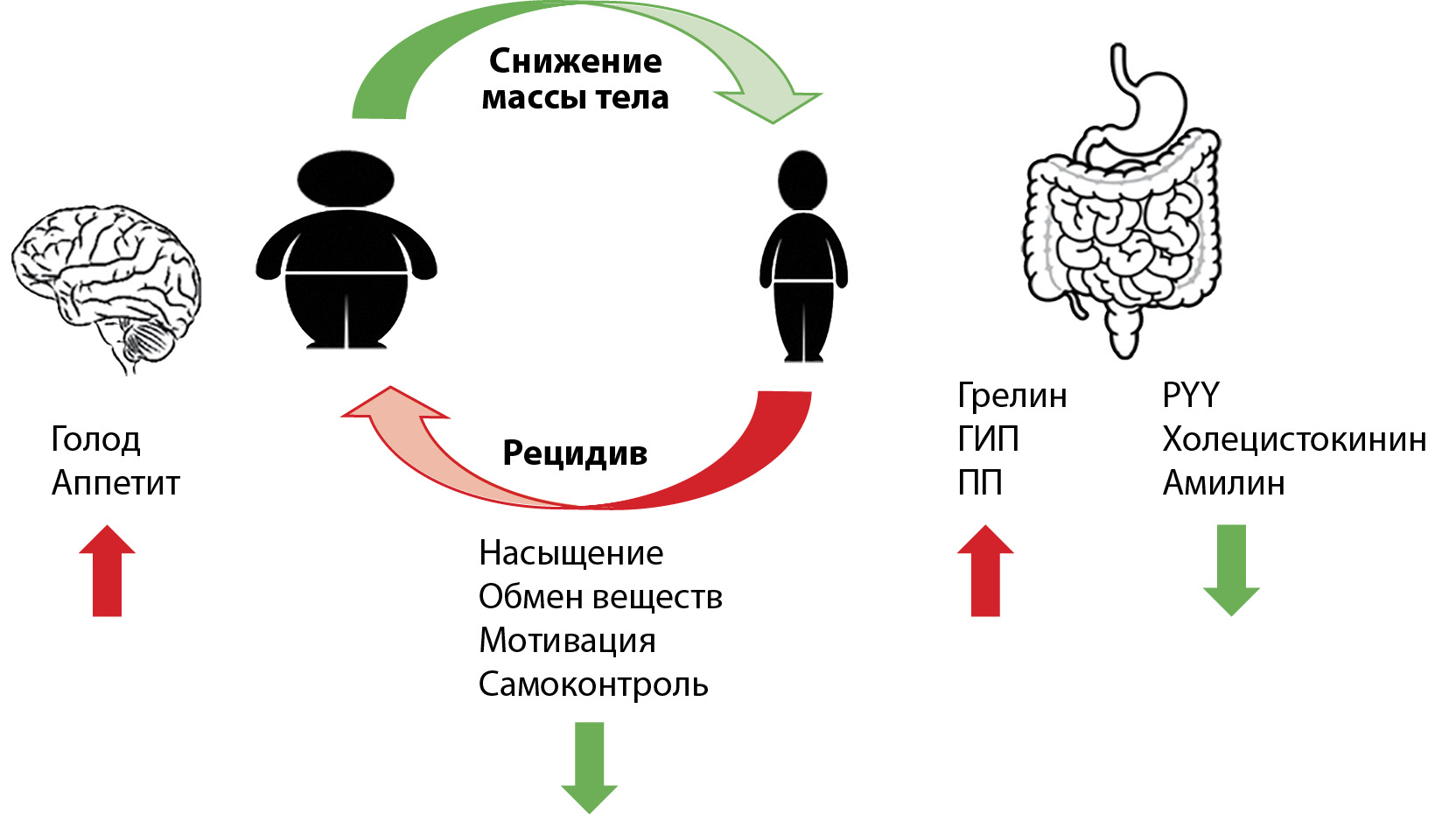 Гормоны ЖКТ — ключевые регуляторы энергетического гомеостаза, которые действуют на центральную нервную систему (ЦНС), контролирующую прием пищи. Дефицит калорий активирует мощные компенсаторные гуморальные механизмы, препятствующие похудению. Главную роль в рецидиве ожирения играют физиологические изменения секреции гормонов ЖКТ. Так, в исследовании по оценке динамики гормонов ЖКТ после снижения массы тела на фоне 10 недель сверхгипокалорийного питания циркулирующие уровни анорексигенных гормонов (пептида YY3-36 (PYY), холецистокинина и амилина) существенно снизились по сравнению с исходным значением. Напротив, уровни орексигенных гормонов, таких как грелин, глюкозозависимый инсулинотропный полипептид (ГИП) и панкреатический полипептид (ПП), увеличились. К 52-й неделе у пациентов отмечалась тенденция к увеличению массы тела, однако гормональный дисбаланс и усиленное чувство голода сохранялись [9]. В исследовании, проведенном среди пациентов с ожирением в течение 8 недель в группе, придерживающихся низкокалорийной диеты со средней потерей веса 13% и последующей 52-недельной программой поддержания веса, снижение массы тела ассоциировалось с высокими уровнями циркулирующих постпрандиальных PYY и глюкагоноподобного пептида-1 (ГПП-1) [10]. Существуют данные, что у пациентов с ожирением и у лиц с нормальным индексом массы тела (ИМТ) при снижении веса наблюдается увеличение уровня грелина и усиление чувства голода. Постпрандиальные концентрации ГПП-1, общего PYY и холецистокинина оставались низкими у людей с ожирением в течение всего периода наблюдения по сравнению с контрольной группой [11]. Аналогичные изменения были продемонстрированы в других исследованиях [12–14]. Эти данные говорят о том, что даже длительное сохранение веса после его исходного снижения не приводит к адаптации секреции гормонов ЖКТ.