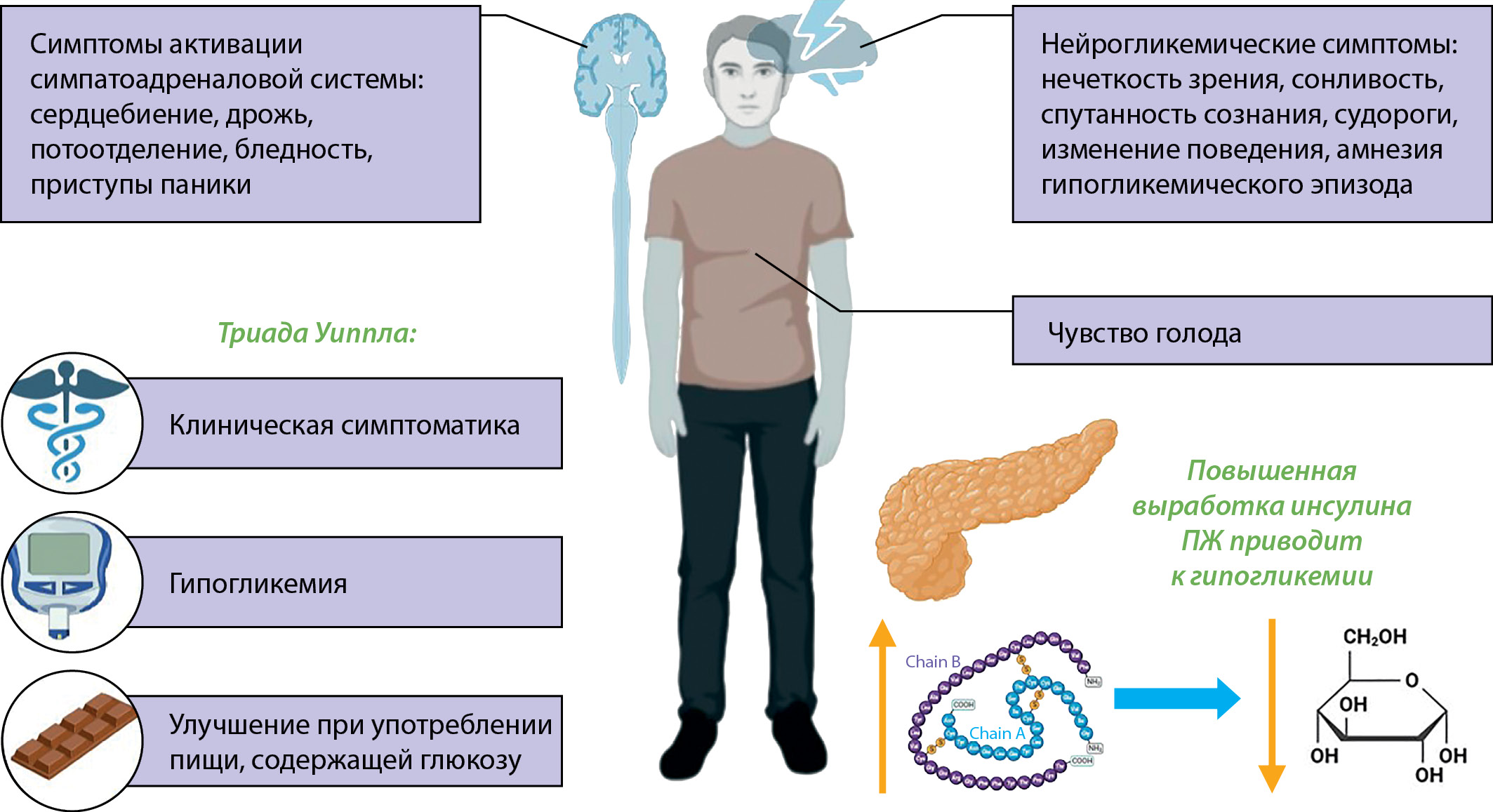 Проявления гипогликемии вариабельны. Они могут включать: чувство голода, симптомы активации симпатоадреналовой системы, в т.ч. сердцебиение, дрожь, потоотделение, приступы паники, а также нейрогликопенические симптомы, такие как нечеткость зрения, спутанность сознания, судороги, изменение поведения, амнезия гипогликемического эпизода [8]. Совокупность симптомов инсулиномы относится к понятию «триада Уиппла» — симптомы гипогликемии, подтвержденная низкая концентрация глюкозы в крови, улучшение самочувствия при приеме продуктов, содержащих глюкозу. Клинические проявления инсулиномы представлены на рис. 1.