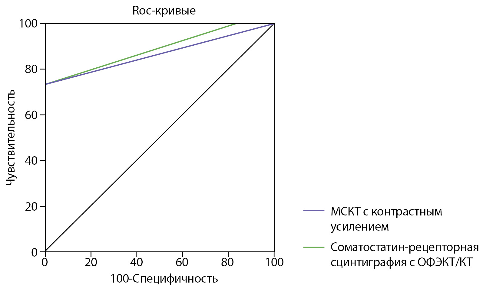 2. Рисунок 2. Прямое сравнение площадей под кривыми операционных характеристик использования МСКТ с контрастным усилением и соматостатин-рецепторной сцинтиграфии с ОФЭКТ/КТ для топической диагностики АКТГ-продуцирующих опухолей