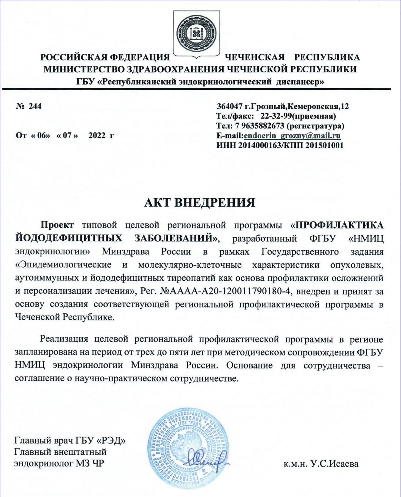 В рамках Соглашения о сотрудничестве Министерства здравоохранения Чеченской Республики с ФГБУ «НМИЦ эндокринологии» Минздрава России сотрудниками НМИЦ эндокринологии совместно с главным внештатным специалистом эндокринологом региона были организованы и проведены исследования, уточняющие структуру тиреоидной патологии среди взрослого населения и приверженность использования йодированной соли, а также клинико-эпидемиологическое исследование для оценки йодной обеспеченности. Исследований подобного рода в Чеченской Республике ранее не проводилось.