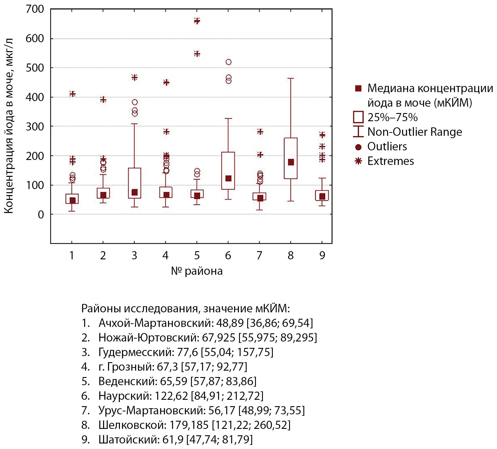 Обработка и анализ статистических данных проводились в программах MS Excel 2016 (Microsoft, США), Statistica 13 (StatSoft, США). Качественные данные представлены в виде абсолютных значений (n) и/или процентов от общего количества — частот (%). В случае описания количественных показателей, имеющих нормальное распределение, полученные данные объединялись в вариационные ряды, в которых проводился расчет средних арифметических величин (M). Совокупности количественных показателей концентрации йода в моче описывались при помощи значений медианы (Me) и нижнего и верхнего квартилей (Q1–Q3).