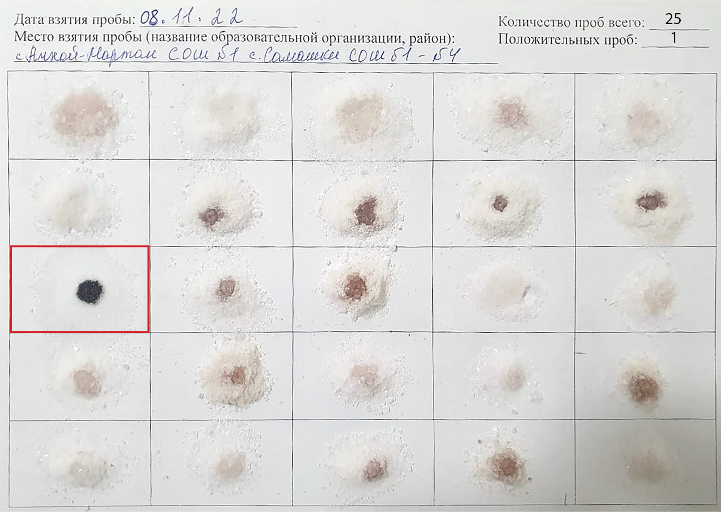 3. Рисунок 3. Результат исследования экспресс-методом образцов пищевой соли, употребляемой в семьях школьников по районам исследования. Положительная качественная реакция на йод в виде окрашивания темно-синего цвета получена только в 1 одной из 25 проб (ячейка выделена красной рамкой).
