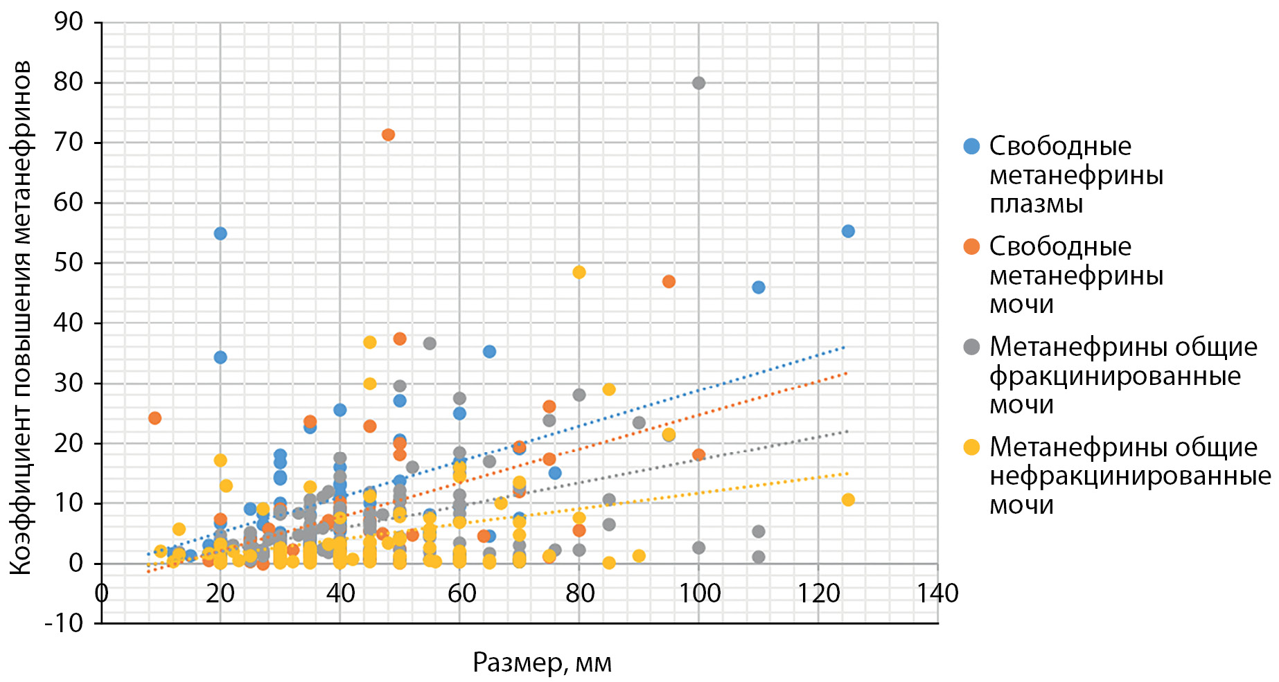 ЗАКЛЮЧЕНИЕ. Исходя из полученных данных, предпочтительными анализами для первичной диагностики феохромоцитом можно назвать определение фракционированных свободных метанефринов плазмы и фракционированных общих метанефринов суточной мочи, что согласуется с существующими клиническими рекомендациями. Размер опухоли коррелирует с выраженностью повышения уровня метанефринов определенным любым из описанных способов.