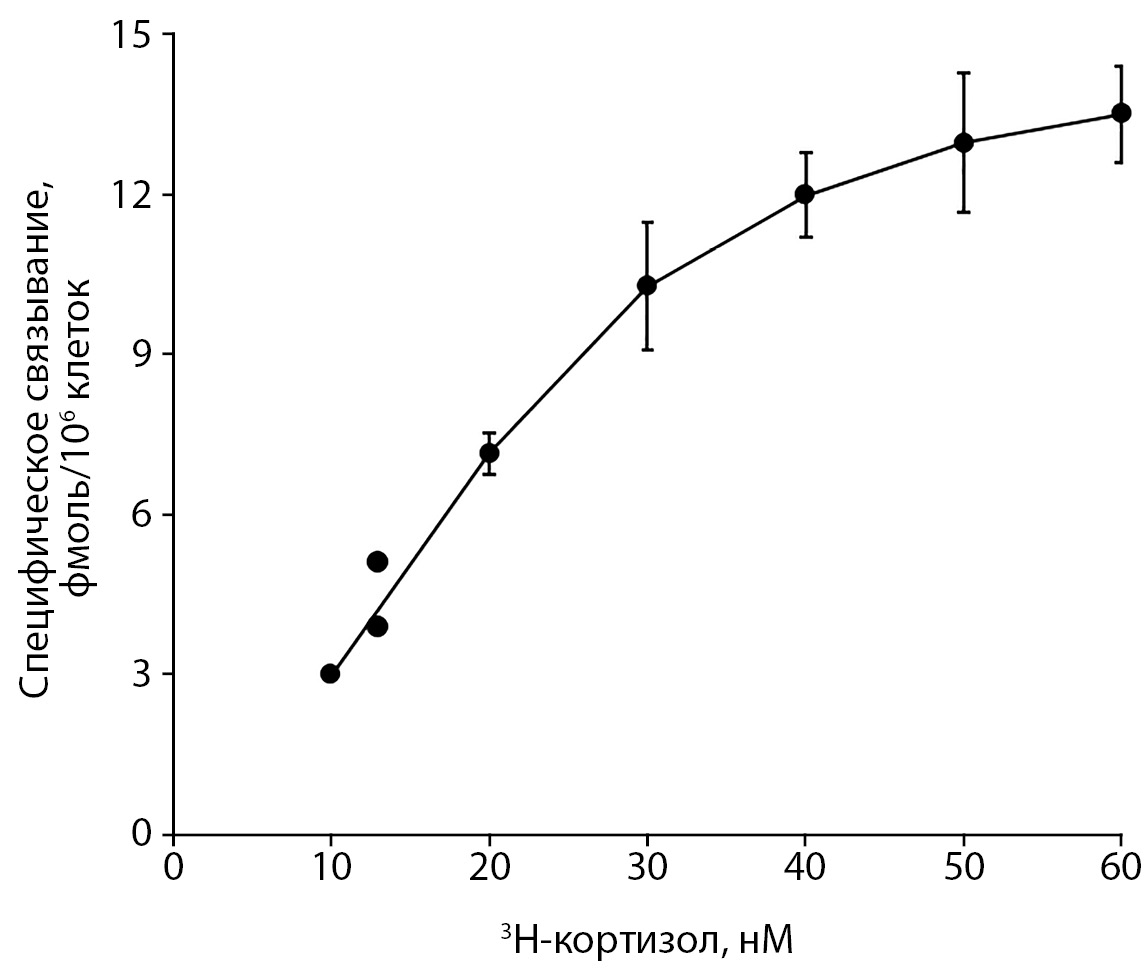 1. Рисунок 1. Параметры связывания рГК лимфоцитами периферической крови пациентки высокомеченным синтетическим глюкокортикоидом 3Н-кортизолом, представленные в координатах Скэтчарда [5]. Кривая специфического связывания (связывание лиганда с рГК) имеет характерный вид изотермы насыщения, что свидетельствует о наличии в клетках высокоспецифических участков связывания гормона.