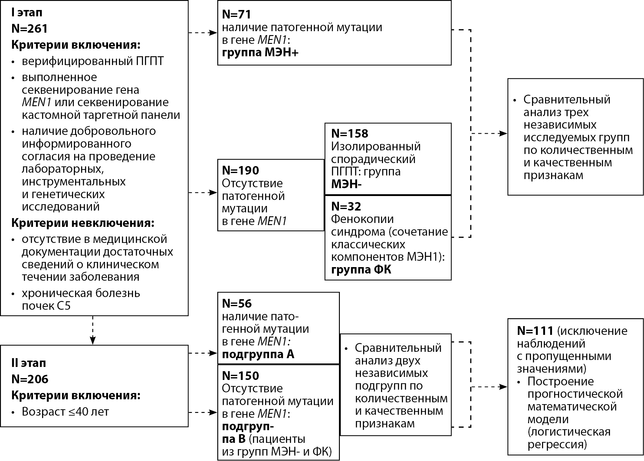 МАТЕРИАЛЫ И МЕТОДЫ. На базе ФГБУ «НМИЦ эндокринологии» Минздрава России проведено одноцентровое одномоментное исследование с включением 273 пациентов с ПГПТ за период 2015–2022 гг. В соответствии с результатами генетического и лабораторно-инструментального исследования выделены 3 группы пациентов: с наличием мутаций в гене MEN1 (МЭН+, n=71), с отсутствием мутаций — с изолированным спорадическим ПГПТ (МЭН-, n=158) и с ПГПТ и сопутствующими образованиями эндокринных желез — фенокопии (ФК) МЭН-1 (ФК, n=32). Отдельно выделены подгруппы пациентов моложе 40 лет. Проведен сравнительный анализ независимых групп и подгрупп, с использованием метода логистической регрессии построена математическая модель прогнозирования вероятности наличия мутации в гене MEN1.