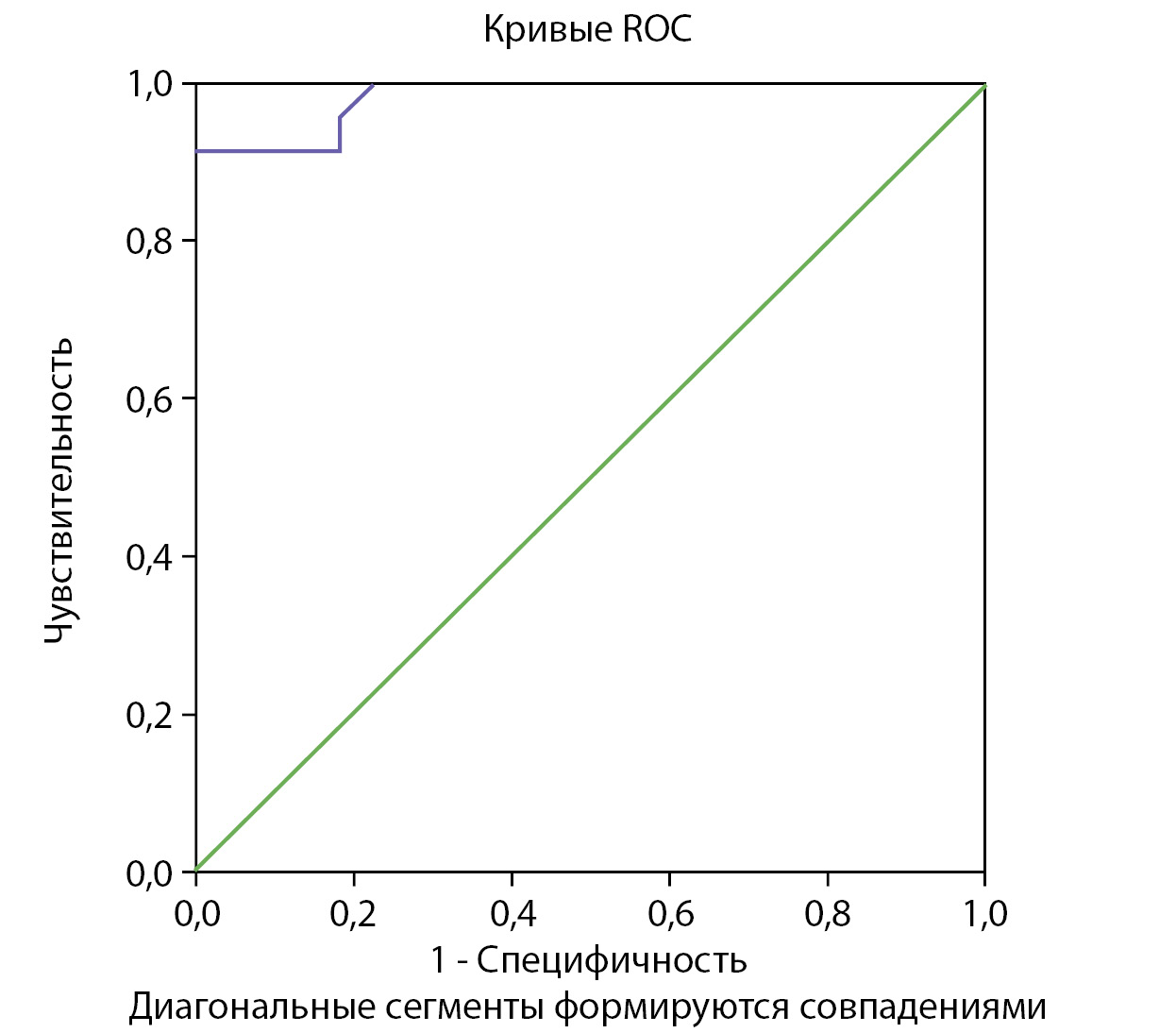 Статистический анализ проводился с помощью пакета прикладных программ Statistica v. 13.3 (TIBCO Software Inc., США). Сравнительный анализ трех независимых исследуемых групп по количественным признакам проведен с помощью критерия Краскела–Уоллиса с дальнейшим post-hoc анализом в случае наличия статистически значимых различий или различий на уровне статистических тенденций. Сравнительный анализ двух независимых групп по количественным признакам проведен с помощью критерия Манна–Уитни. Сравнение независимых групп по качественным признакам проводили с помощью двустороннего точного критерия Фишера. Уровень значимости (р) при проверке статистических гипотез принимался равным 0,05. Для коррекции критического уровня значимости при множественных сравнениях применялась поправка Бонферрони (р0), после чего значения р в диапазоне между рассчитанным р0 и 0,05 интерпретировались как статистическая тенденция. Для построения математической модели логистической регрессии и выполнения ROC-анализа был использован пакет прикладных программ SPSS Statistics v. 17.0 (SPSS: An IBM Company, США).