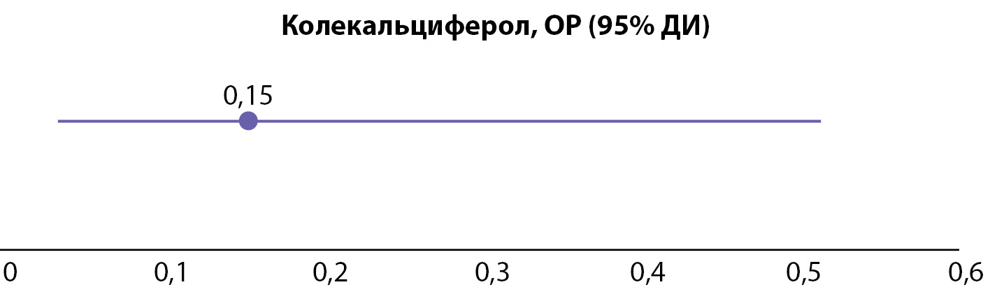 При анализе ассоциаций предоперационного приема нативной формы витамина D и развития гипокальциемии в раннем послеоперационном периоде обнаружено, что частота гипокальциемии в группе колекальциферола примерно в 6 раз меньше (табл. 2), а ОР составляет 0,15, 95% ДИ (0,03; 0,51). Таким образом, прием колекальциферола снижает риск развития послеоперационной гипокальциемии в 2–33 раза (рис. 2).