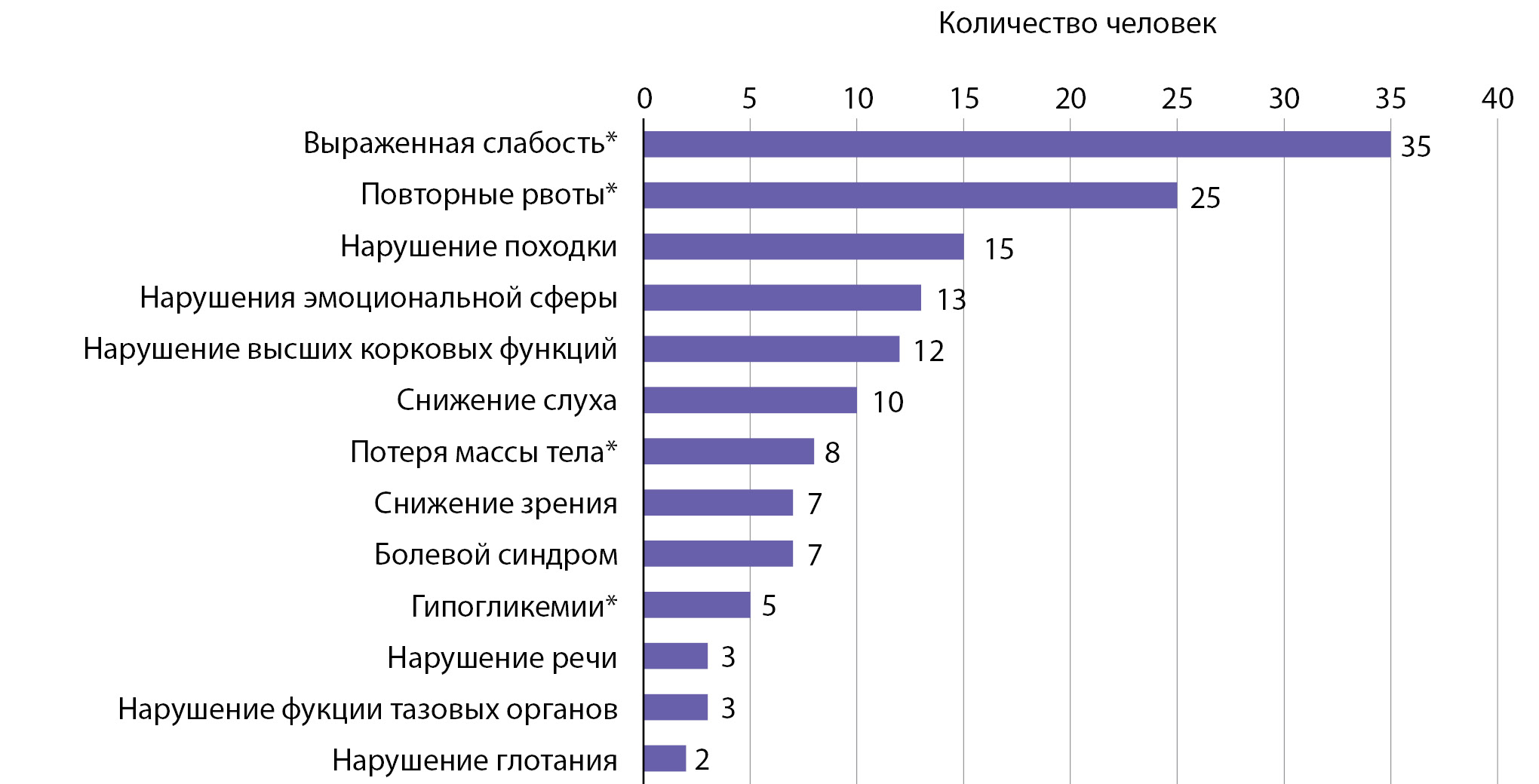 Примечание: на данной диаграмме представлены жалобы на момент манифестации заболевания. Общее число пациентов — 66 человек. Символом «*» отмечены жалобы, более характерные для надпочечниковой недостаточности.