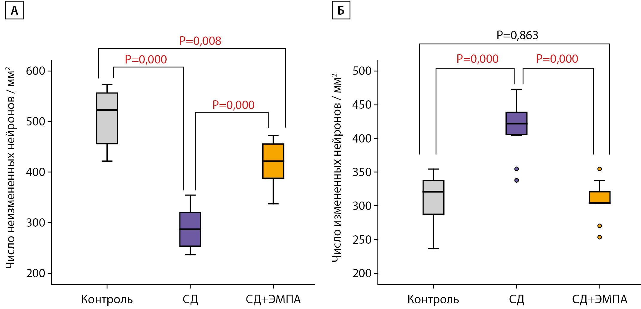 РЕЗУЛЬТАТЫ. Как в группе «МЕТ+ЭМПА», так и в группе «МЕТ», наблюдался когнитивный дефицит, по данным Монреальской шкалы когнитивной оценки (МОСА) (24,0 (23,0; 27,0) и 25,0 (21,0; 27,0) баллов) и Краткой шкалы оценки психического статуса (MMSE) (23,75 (23,0; 27,0) и 25,0 (21,0; 27,0) баллов). Терапия эмпаглифлозином привела к нормализации когнитивного статуса через 6 мес. (26,5 (24,0; 27,0) балла по шкале МОСА и 27,5 (24,0; 28,0) балла по MMSE). Исходно у всех пациентов имелось достоверное повышение НСЕ (3,60 (2,66; 3,76) нг/мл в группе «МЕТ», 3,22 (2,94; 3,54) нг/мл в группе «МЕТ+ЭМПА», 2,72 (2,13; 2,72) нг/мл в группе «Контроль») и ЛЦН (4,50 (3,31; 5,56) нг/мл в группе «МЕТ», 5,25 (3,75; 6,25) нг/мл в группе «МЕТ+ЭМПА» при 3,50 (2,25; 3,50) нг/мл в группе «Контроль»). Терапия эмпаглифлозином привела к достоверному снижению ЛЦН уже через 3 мес. (3,80 (3,25; 3,87) нг/мл), значимо не повлияв на уровень НСЕ. В эксперименте СД характеризовался увеличенным количеством активированных микроглиоцитов и деструктурированных нейронов и снижением числа нейронов с нормальной структурой. Терапия эмпаглифлозином сопровождалась уменьшением числа иммунопозитивных микроглиоцитов в СА1 зоне гиппокампа и увеличением числа структурированных нейронов.