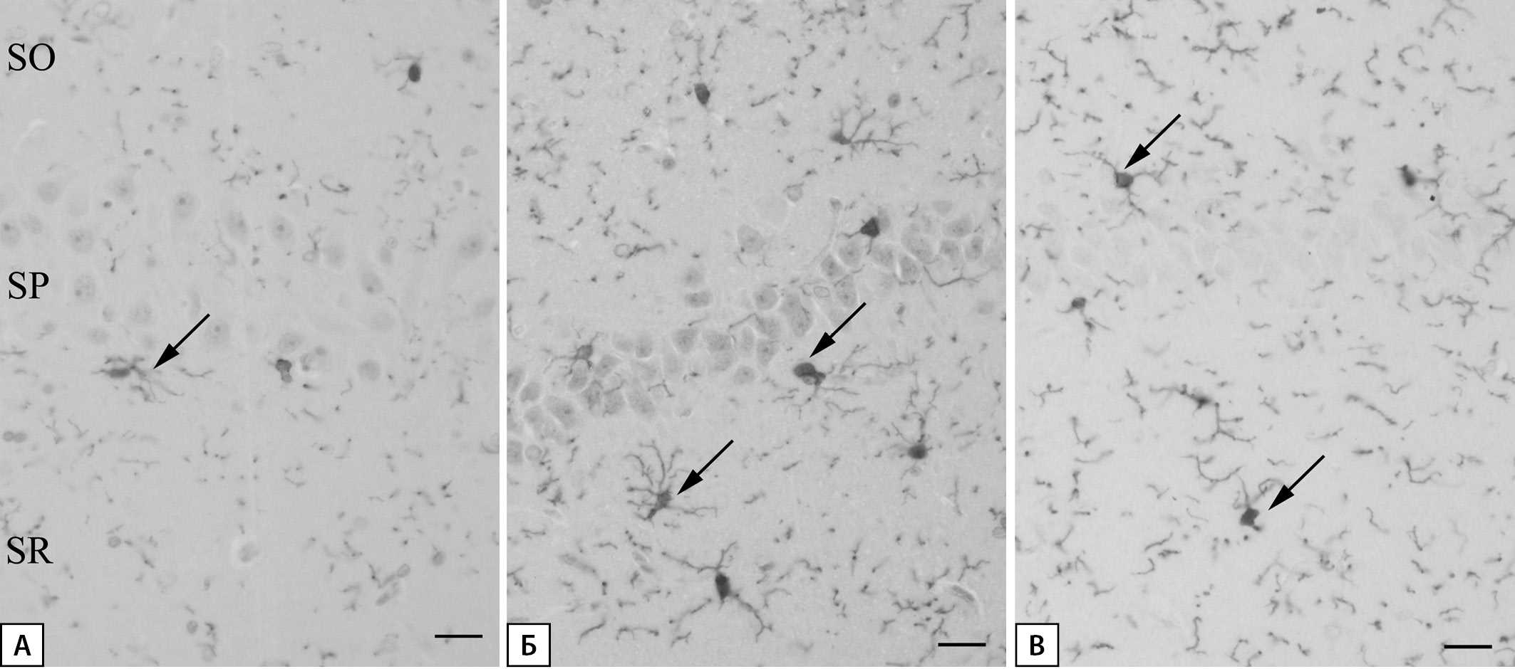 После эвтаназии во всех группах производилось извлечение головного мозга с сохранением мягкой мозговой и паутинной оболочек, фиксация в цинк-этанол-формальдегиде [12], обезвоживание и заливка в парафин. Морфологическому исследованию подвергали фронтальные срезы конечного мозга толщиной 5 мкм на уровне –3,36 мм±0,12 мм относительно брегмы. С целью оценки морфологического состояния нейронов зоны CA1 гиппокампа срезы окрашивали толуидиновым синим по методу Ниссля. Производилось выявление микроглиоцитов в структурах переднего мозга при помощи иммуноцитохимического маркирования с использованием козьих поликлональных антител к Iba-1 в разведении 1:1000 (Abсam, Великобритания). В качестве вторичных реагентов использовали набор VECTASTAIN Universal Quick HRP kit (Vector Labs, США). Пероксидазную метку выявляли с использованием диаминобензидинового хромогена (DAB+; Аgilent, США).