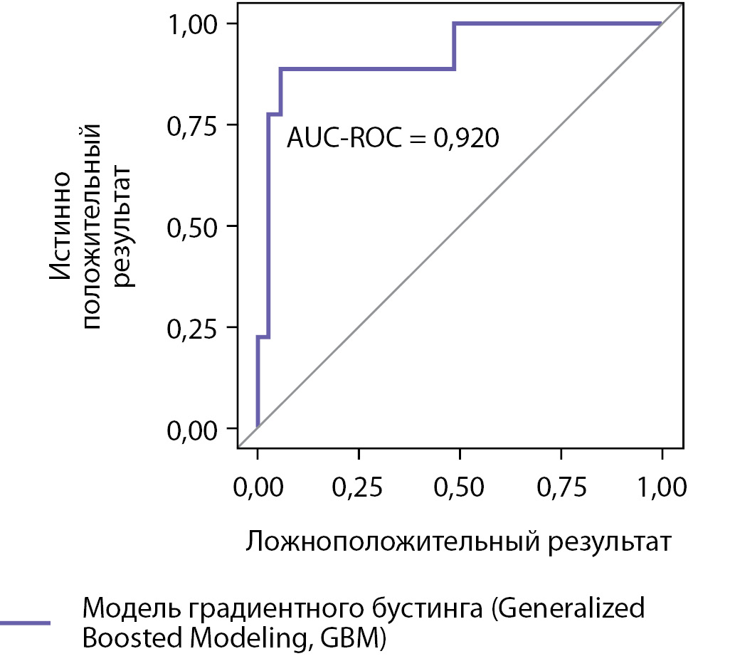RESULTS: The study included 223 patients (163 women, 60 men) with ACTH-dependent hypercortisolism, of which 175 patients with Cushing’s disease (CD), 48 — with EAS. As a result of preliminary data processing and selection of the most informative signs, the final variables for the classification and prediction of EAS were selected: ACTH level at 08:00 hours, potassium level (the minimum value of potassium in the active stage of the disease), 24-h urinary free cortisol, late-night serum cortisol, late-night salivary cortisol, the largest size of pituitary adenoma according to MRI of the brain. The best predictive ability in a training sample of all trained machine learning models for all three final metrics (ROC-AUC (0.867), sensitivity (90%), specificity (56.4%)) demonstrated a model of gradient boosting (Generalized Boosted Modeling, GBM). In the test sample, the AUC, sensitivity and specificity of the model in predicting EAS were 0.920; 77.8% and 97.1%, respectively.