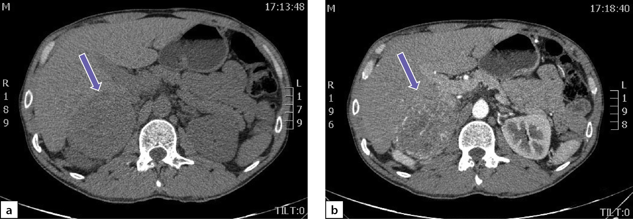 2. Рисунок 2. Феохромоцитома правого надпочечника: а) нативная фаза; b) после введения контрастного препарата. | |