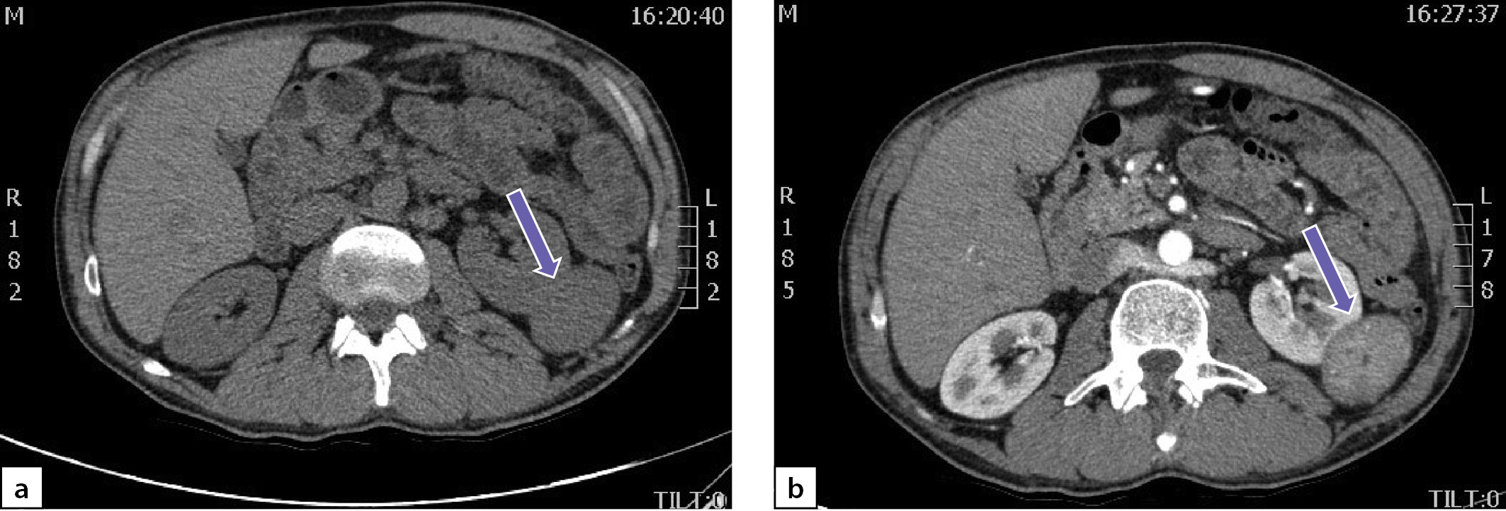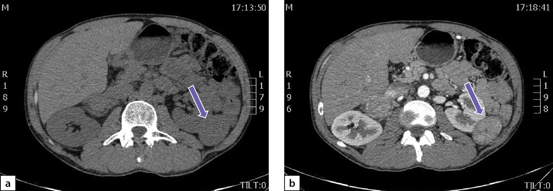 3. Рисунок 3. Образование забрюшинного пространства слева: а) нативная фаза; b) после введения контрастного препарата. | |