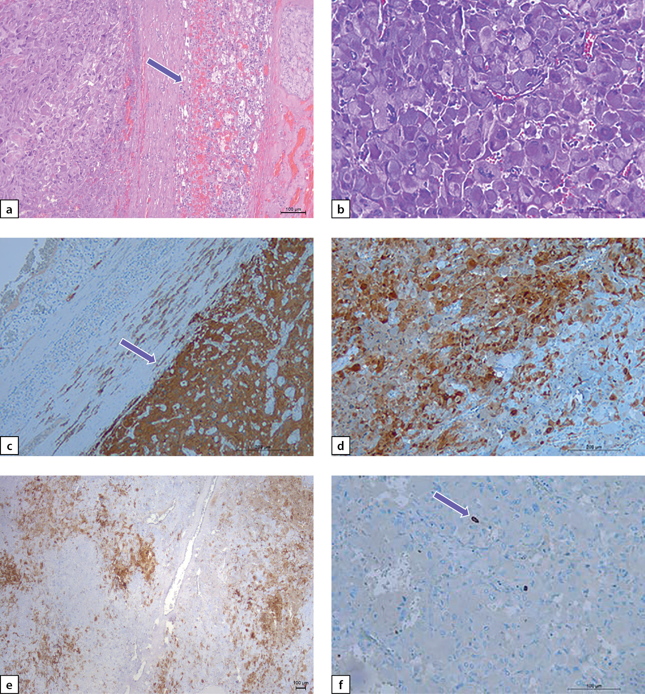 По данным гистологического исследования: опухоль правого надпочечника солидного строения из полиморфных, преимущественно из светлых клеток с онкоцитарной морфологией с широкой эозинофильной гранулированной цитоплазмой, умеренным ядерным полиморфизмом (рис. 5 a, b). Митозы, некрозы, инвазия сосудов не обнаружены. Для уточнения гистогенеза опухоли и ее клинического прогноза было выполнено ИГХ-исследование: клетки опухоли интенсивно диффузно экспрессировали синаптофизин и хромогранин А (рис. 5 c). Экспрессия протеина S-100 была неравномерной и выявлялась очагово в цитоплазме и ядрах опухолевых клеток и только в единичных сустантекулярных (поддерживающих) клетках (рис. 5 d, e). Экспрессия виментина также была очаговой, неравномерной, индекс пролиферации Ki-67 был в пределах 1,5% (рис. 5 f). Заключительный патоморфологический диагноз: «Феохромоцитома правого надпочечника, онкоцитарный вариант».