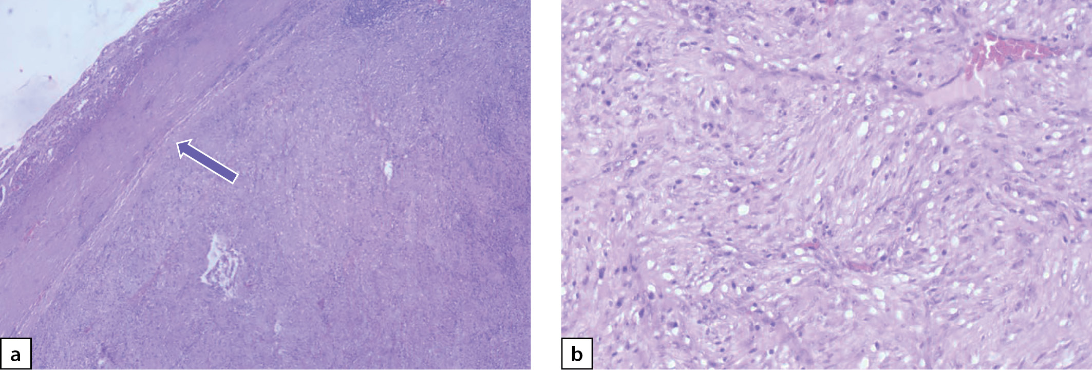 7. Рисунок 7 a–b. Опухоль забрюшинного пространства. Макропрепарат. b. Образование в разрезе. | |