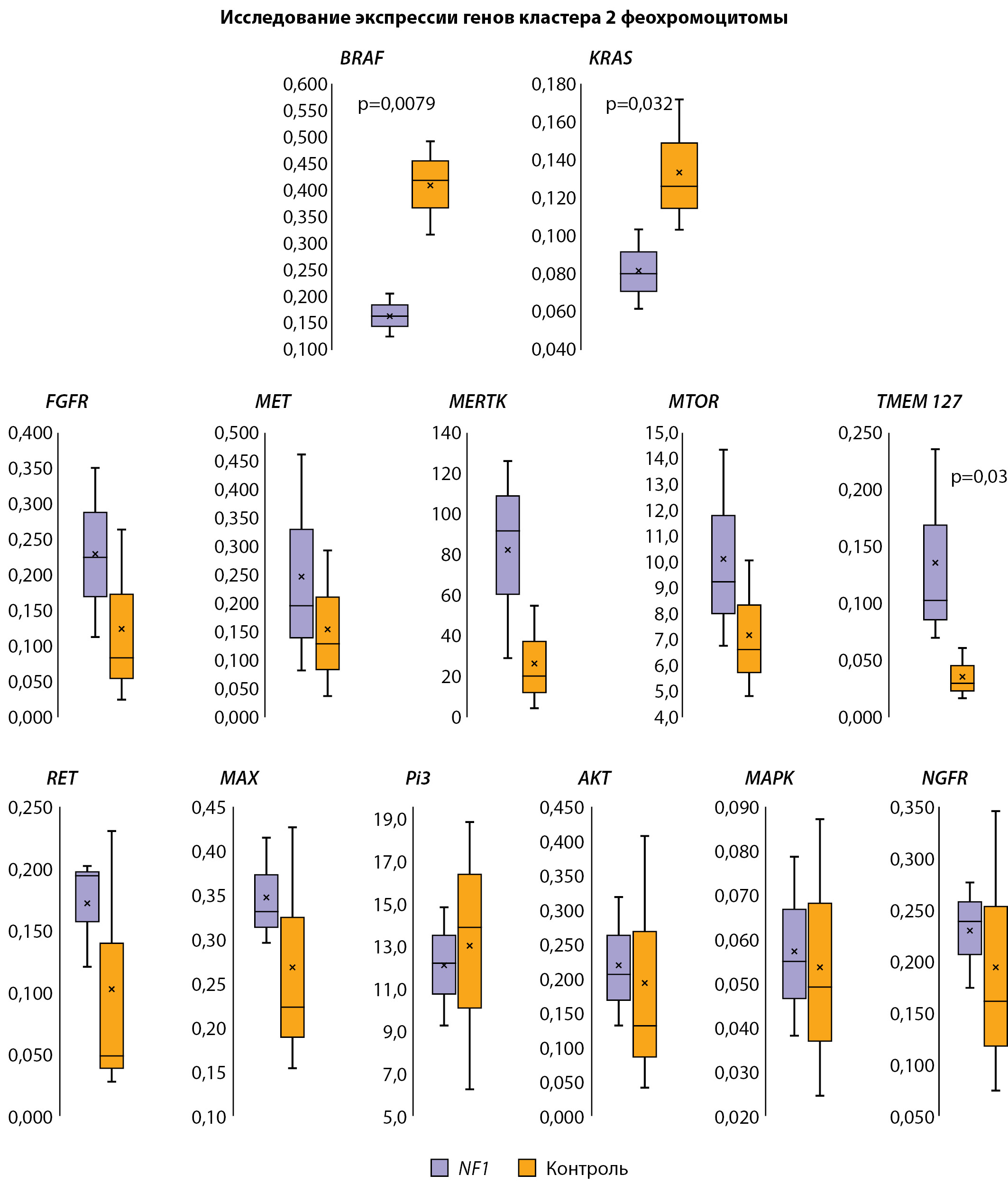 Помимо мутации гена NF1, были зафиксированы комплексные изменения активности других генов (RET, FGFR, TMEM127, MAX, MET, MERTK, NGFR, Pi3, AKT, MTOR, MAPK). Для выявления причины предполагаемого неравномерного изменения экспрессии генов кластера 2 ФХЦ, связанной с мутацией в гене NF1, необходимо проведение дальнейших исследований.