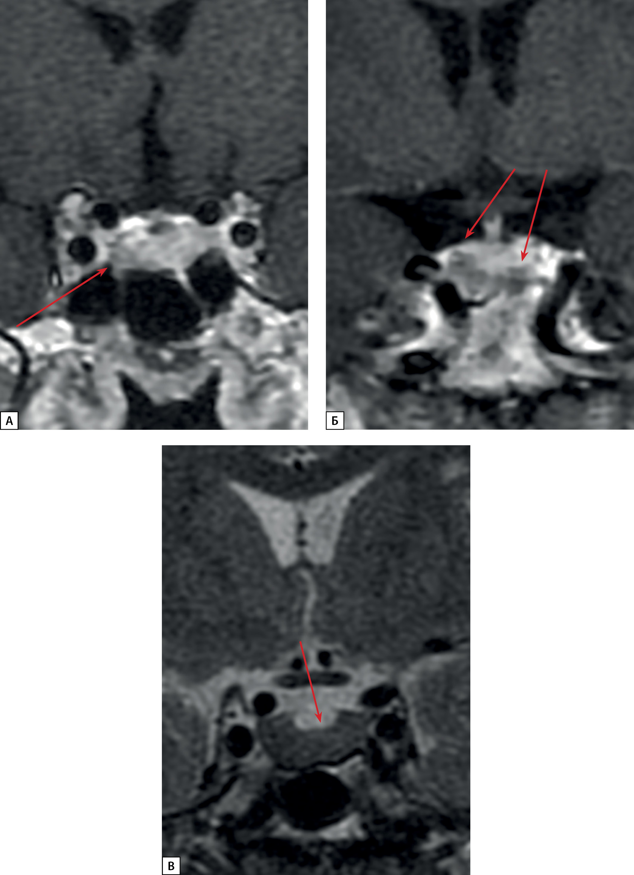 2. Figure 2. MRI of the pituitary gland of patient S.N.Yu., coronal projection: A. T1 WI with contrast enhancement. Microadenoma in the left part of the adenohypophysis (arrow) B. T1 WI with contrast enhancement. Rathke's pouch cyst (arrows) B. T2 VI. Diffusely reduced MR signal on T2 WI from adenohypophysis tissue (arrow) | |