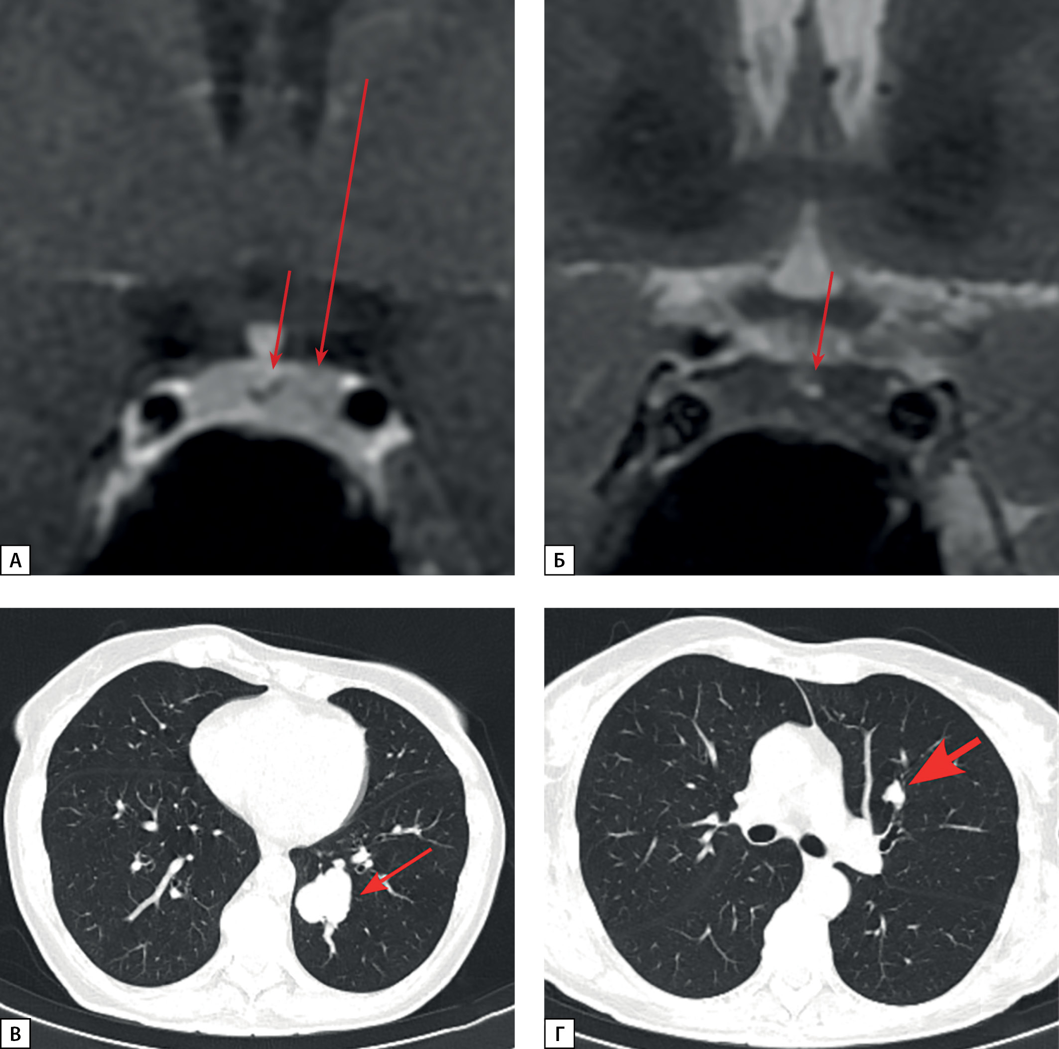4. Figure 4. MRI and CT examination of patient D.I.E. a) MRI of the pituitary gland, coronal projection, T1 VI with contrast enhancement. Rathke's pouch cyst (arrow). An area of slightly reduced contrast agent accumulation in the left part of the adenohypophysis (long arrow); b) Rathke's pouch cyst (arrow). Diffusely reduced MR signal on T2 WI from adenohypophysis tissue; c) MSCT of the lungs, pulmonary mode, native phase, axial projection. Neuroendocrine tumor in S10 of the left lung (short arrow); d) MSCT of the lungs, pulmonary mode, native phase, axial projection. The mass in S3 of the left lung with intra- and peribronchial spread is the focus of screening (thick arrow). | |