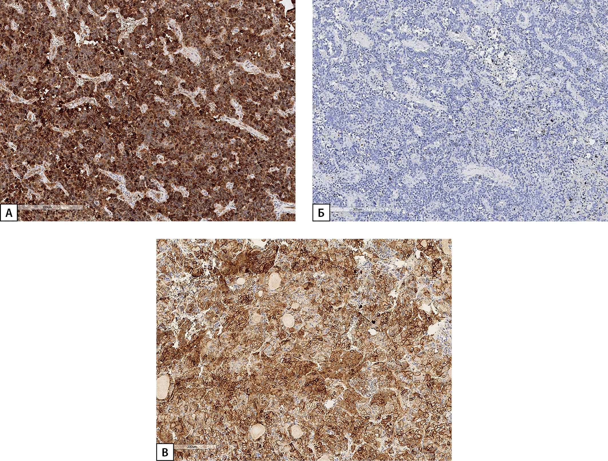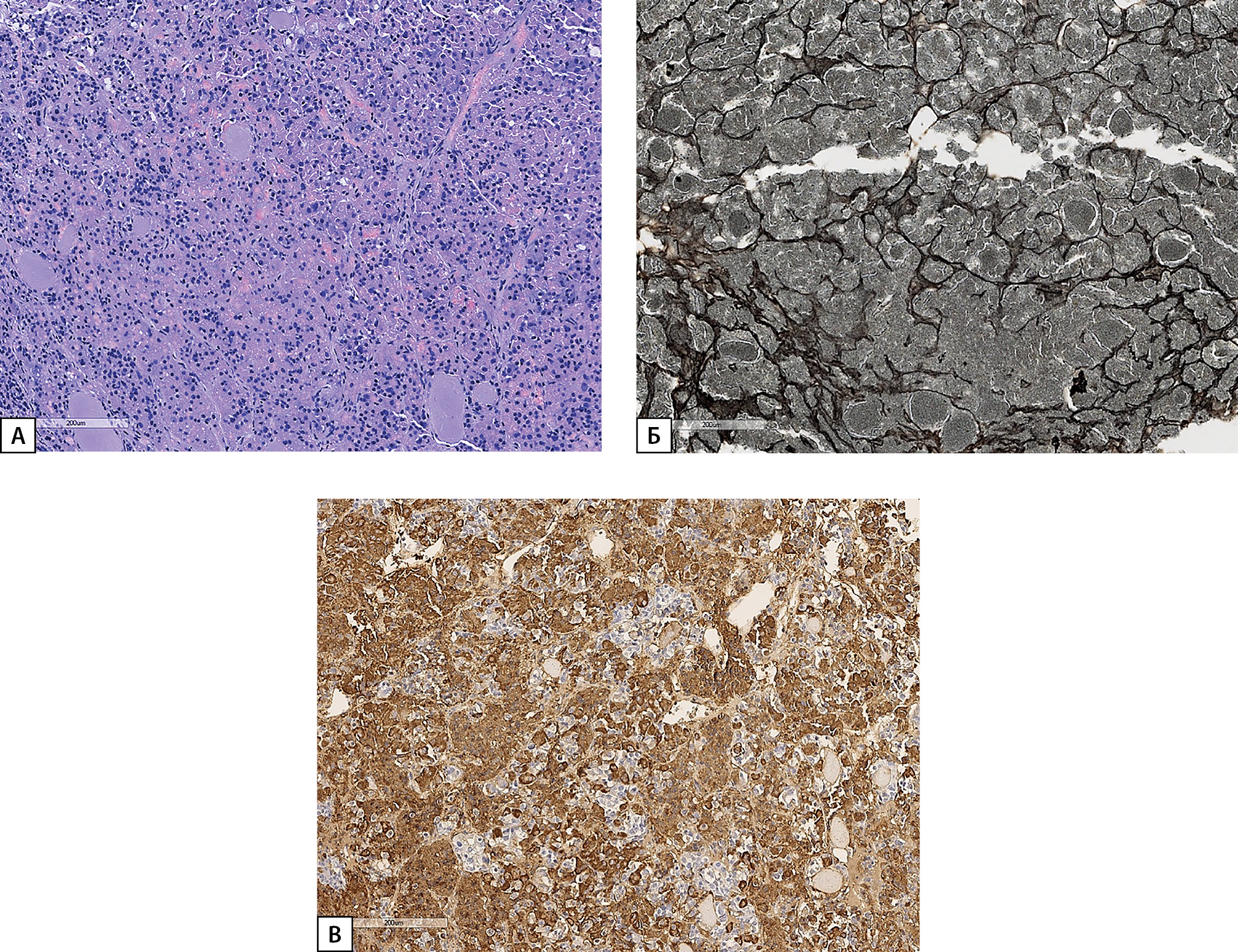 5. Figure 5. Histological and immunohistochemical examination of surgical material from the pituitary gland of patient D.I.E. (A) - adenohypophysis tissue with extensive fields of oxyphilic cells (hemotoxylin-eosin). (B) - preserved network of reticulin fibers with dilated acini (impregnation with silver). (B) - diffuse staining of cells of the adenohypophysis with GH (immunohistochemical reaction with antibodies to GH). Histoscans. | |