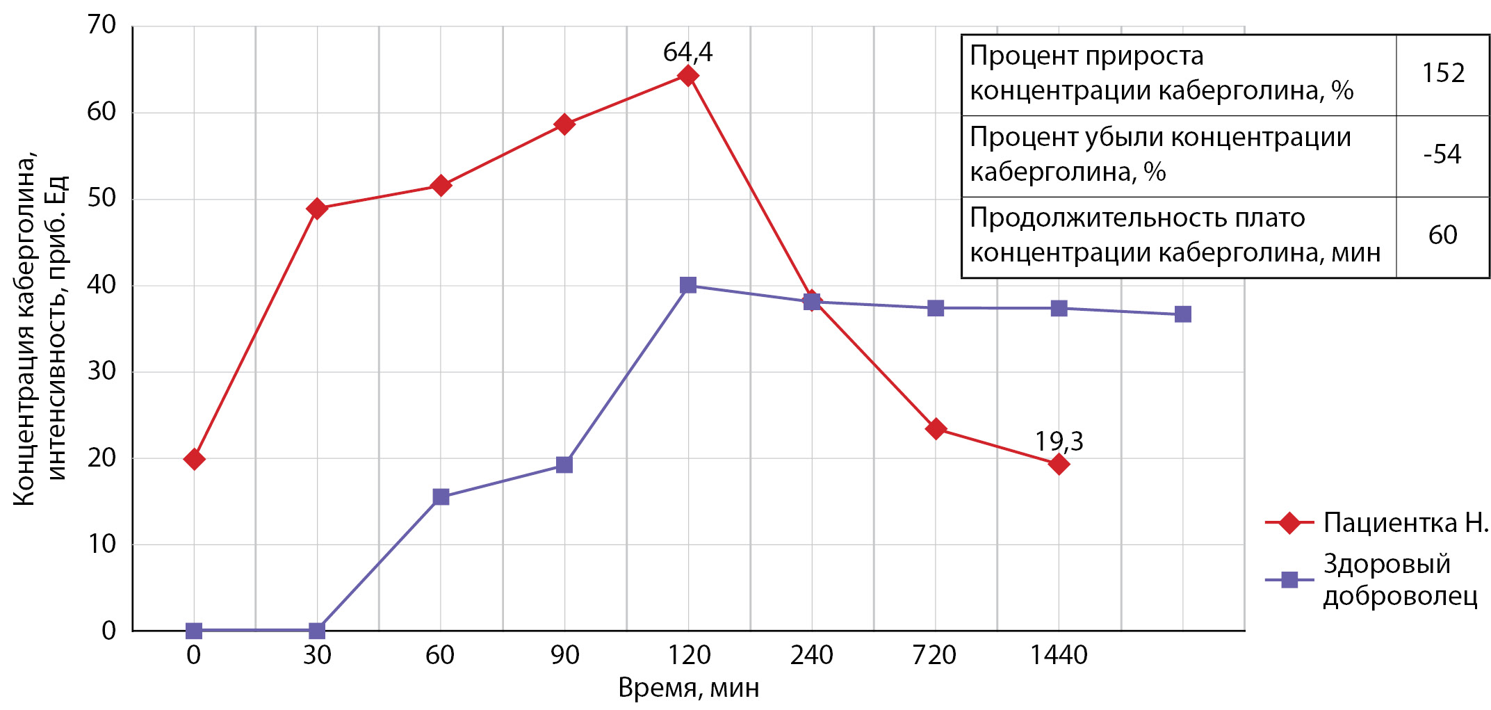 Известно, что одной из причин резистентности к терапии агонистами дофамина является наличие фармакодинамических особенностей. С целью оценки метаболомных характеристик пациентке проведена проба с каберголином, результаты которой подтвердили наличие предполагаемых метаболомных дефектов — концентрация каберголина в сыворотке крови достигала закономерного пика, однако ожидаемое плато концентрации препарата, опосредованное длительным периодом его полувыведения, впоследствии не наблюдалось (табл. 1, рис. 1).
