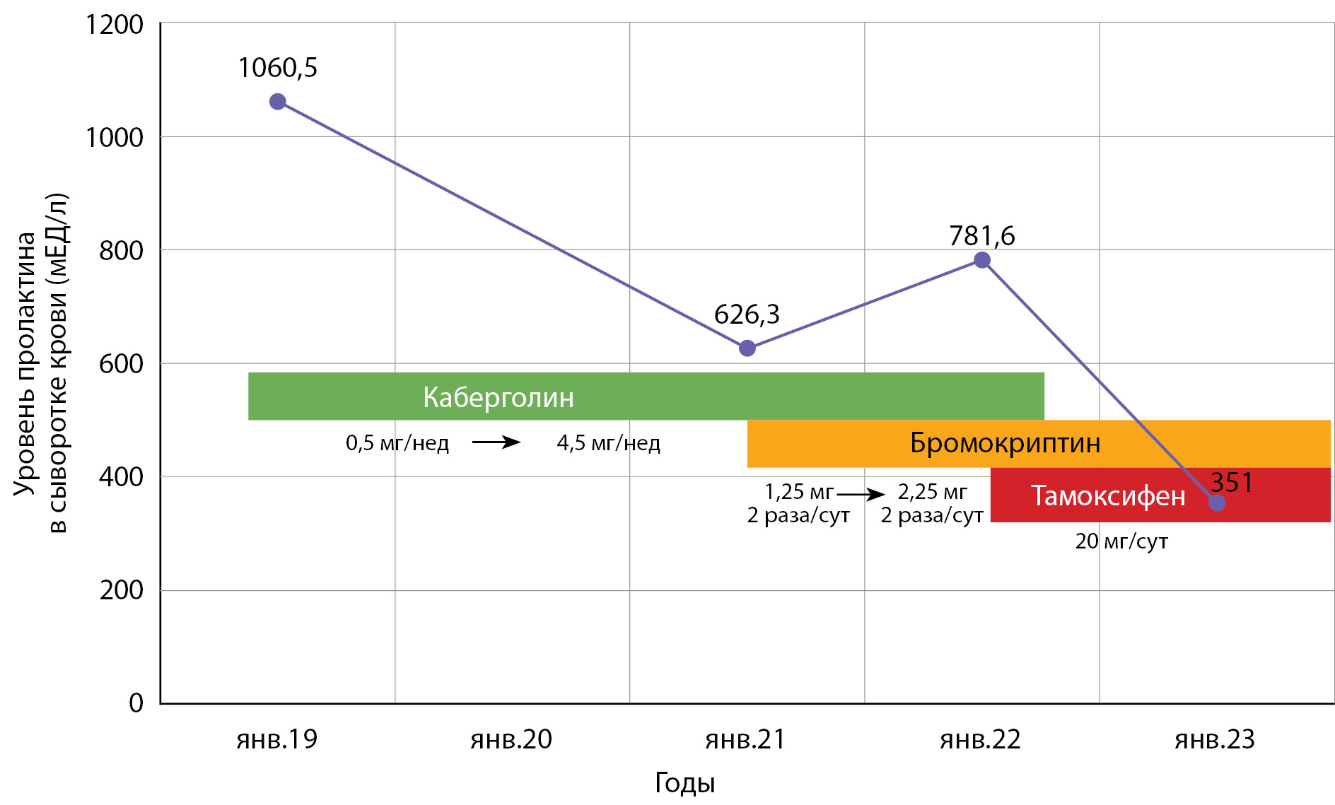 Несмотря на регулярный прием препарата, достичь снижения уровня пролактина в сыворотке крови не удавалось. Постепенно доза каберголина увеличена до 4,5 мг в неделю, однако положительная динамика клинико-лабораторных показателей и состояния здоровья пациентки не была достигнута.