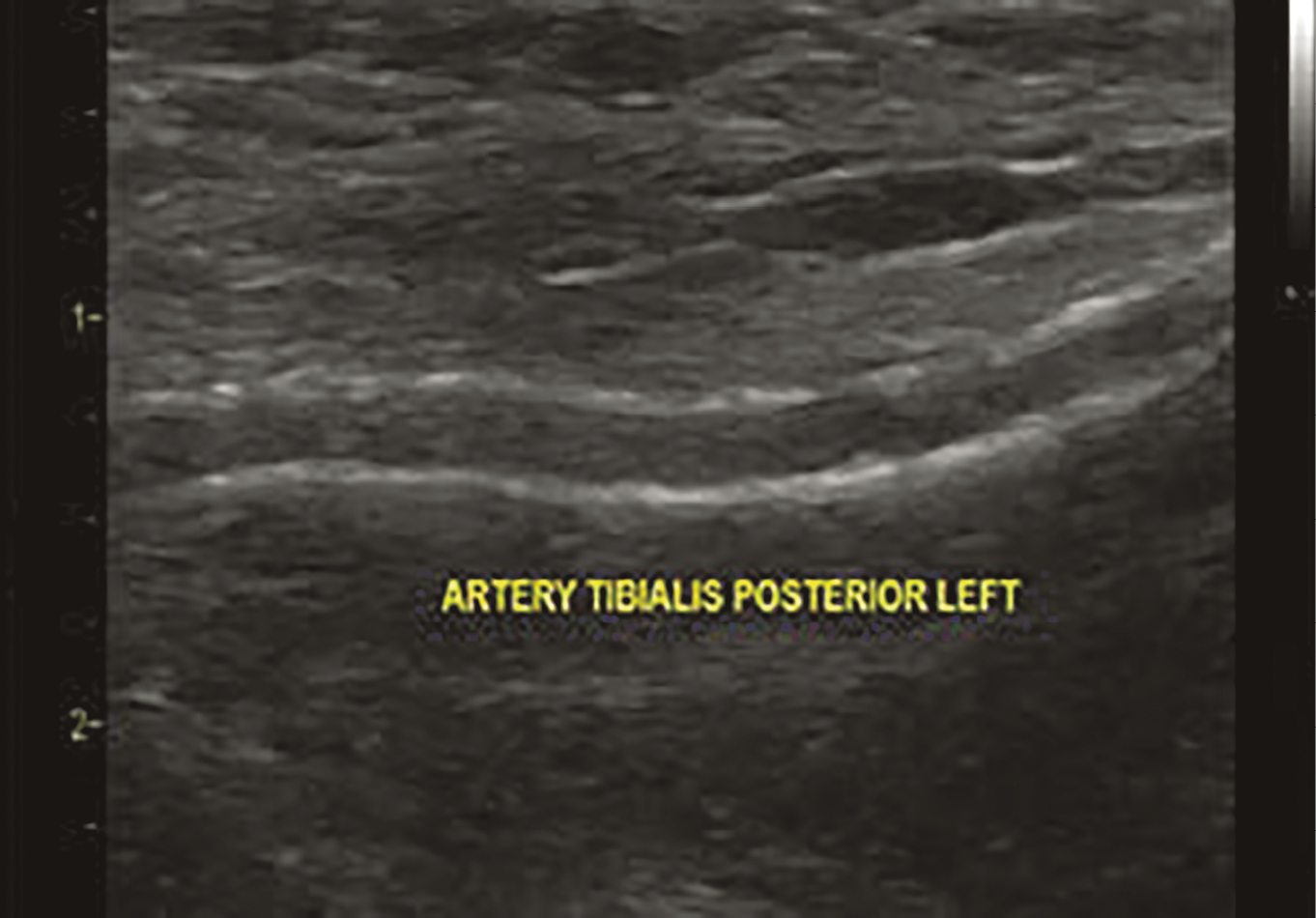 1. Рисунок 1. Эхограмма. В-режим. Кальциноз стенки задней большеберцовой артерии у пациента 73 лет с СД2 более 20 лет и хронической почечной недостаточностью.
