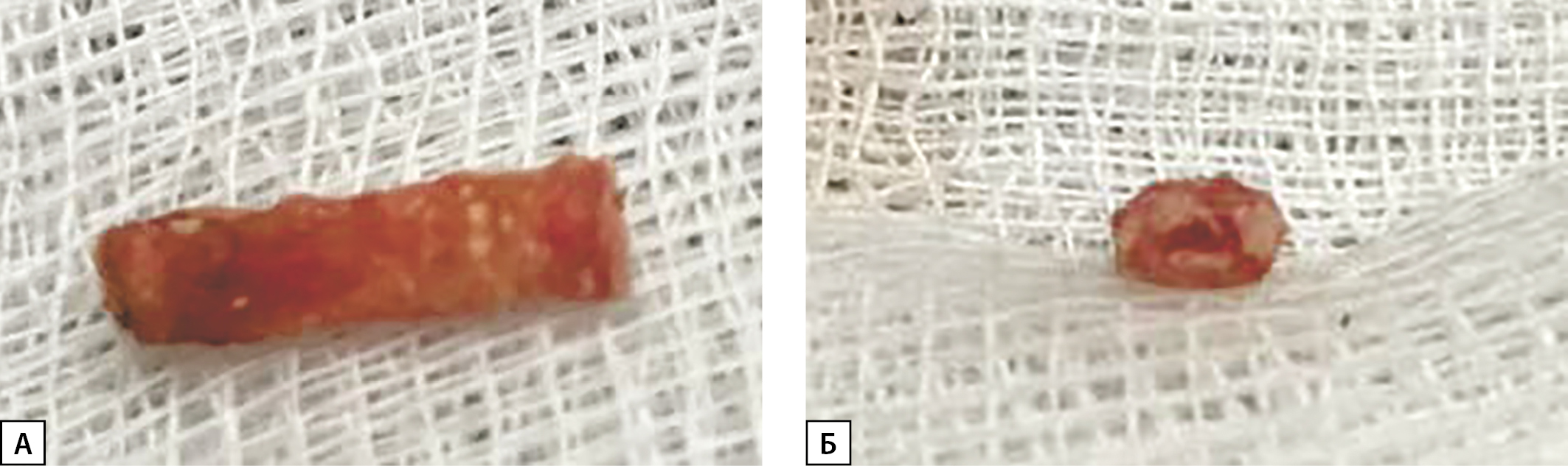 2. Рисунок 2. Фотографии. Кальцинированная тыльная плюсневая артерия стопы в 1 межфаланговом промежутке (операционный материал).