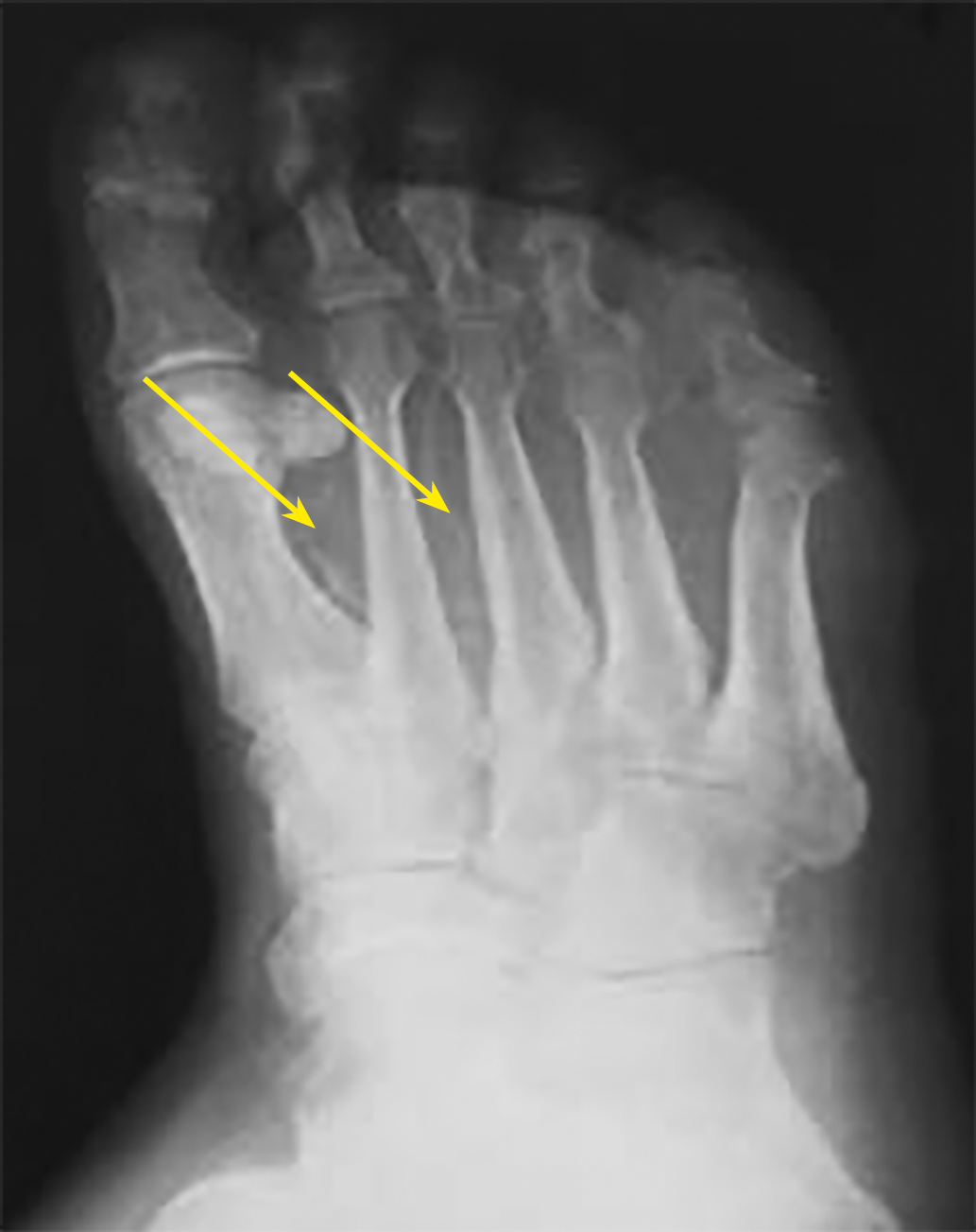 Рисунок 3. Рентгенограмма стопы. Кальциноз артерий стопы (указано стрелками).