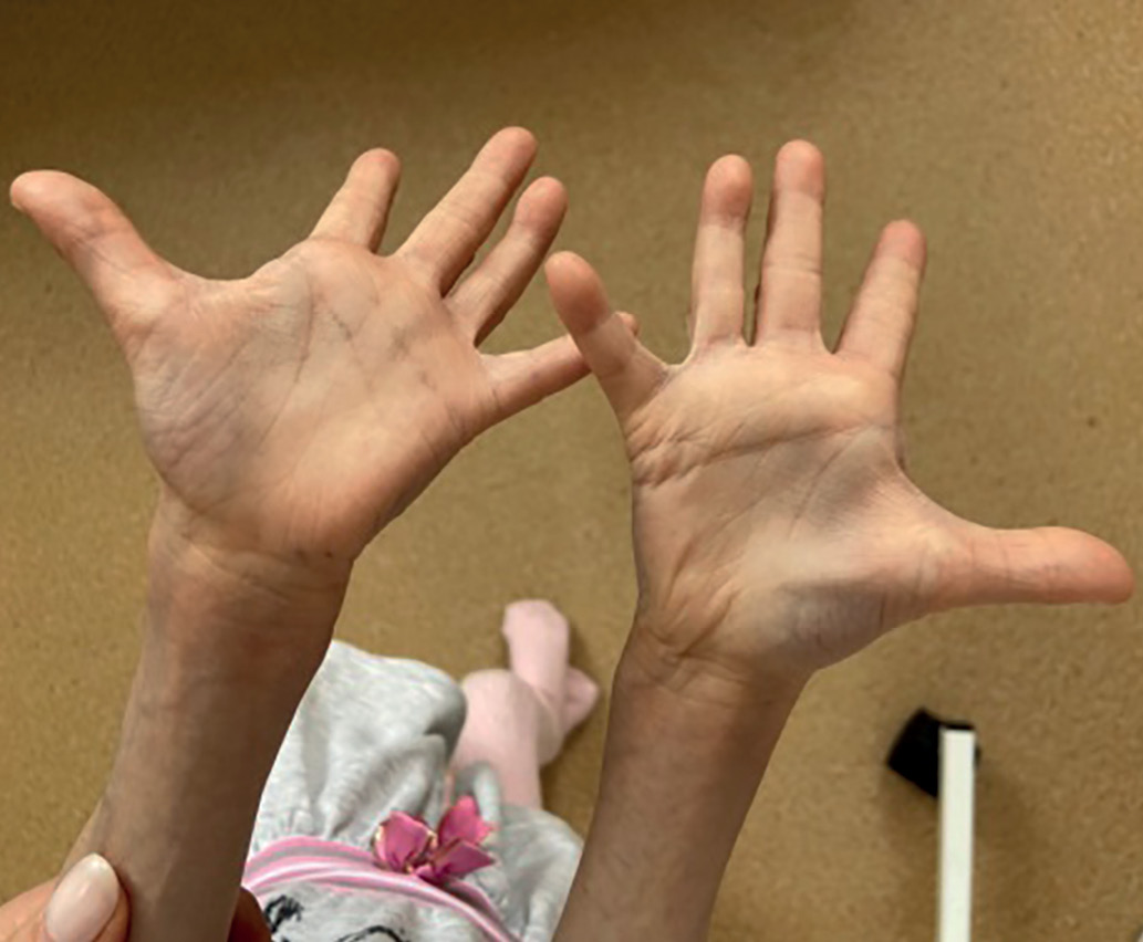 При повторной госпитализации в июне 2023 г. (7 лет 6 месяцев) отмечалось прогрессирование задержки роста и дефицита массы тела. Рост — 103 см (SDS роста -3,41), скорость роста — 3,64 см/год (SDS скорости роста -2,47), вес — 10,35 кг, ИМТ — 9,71 кг/м² (SDS ИМТ -6,20), половое развитие по Таннеру 1 (рис. 2–3). По результатам расширенного общеклинического анализа крови, мочи и кала, биохимического анализа крови, коагулограммы клинически значимых отклонений не выявлено. В липидном профиле отмечалась тенденция к гипохолестеринемии и незначительная гипертриглицеридемия (при оценке в соответствии с возрастными нормативами): холестерин общий — 3,15–3,44 ммоль/л (N 3,26–5,30), триглицериды — 1,28–1,51 ммоль/л (N 0,40–1,24), липопротеины высокой плотности (ЛПВП) — 0,73–1,14 ммоль/л (N 0,93–1,89), липопротеины низкой плотности (ЛПНП) — 1,73–2,18 ммоль/л (N 1,76–3,63), липопротеины очень низкой плотности (ЛПОНП) — 0,58–0,69 ммоль/л (N 0,19–0,77).