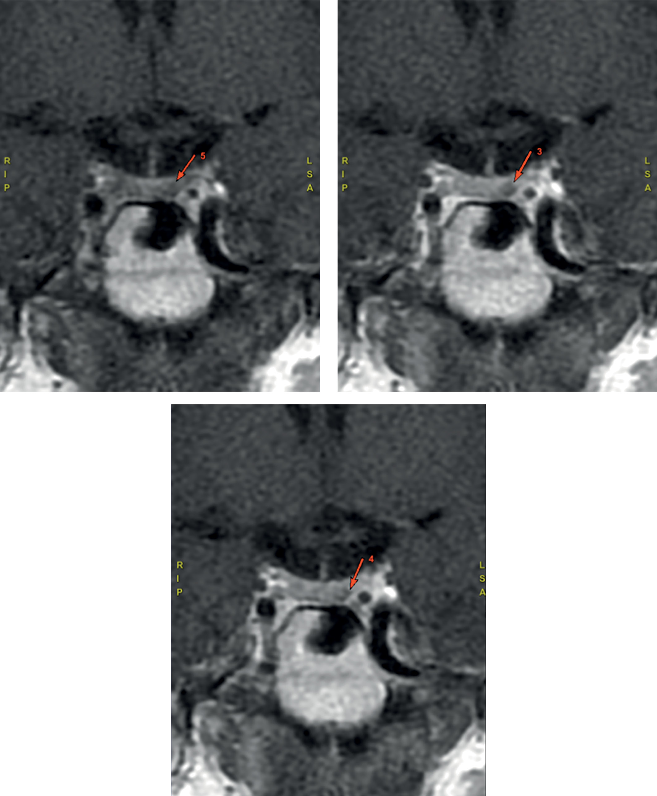 1. Рисунок 1. Магнитно-резонансная томография гипофиза — стрелками указана микроаденома задней части аденогипофиза.