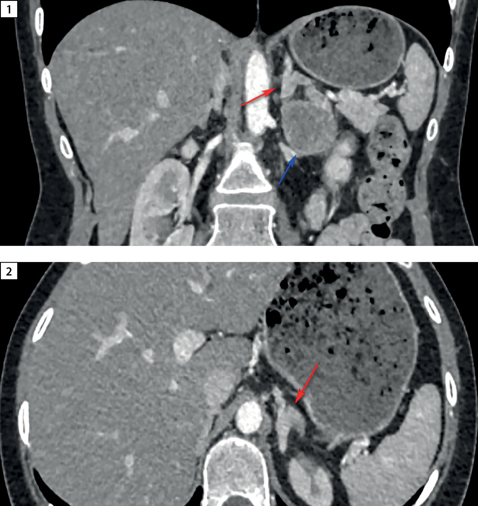2. Рисунок 2. Визуализация левого надпочечника на МСКТ органов забрюшинного пространства: 1 — красная стрелка указывает на левый надпочечник, синяя стрелка — на опухолевое образование; 2 — красная стрелка указывает на левый надпочечник.