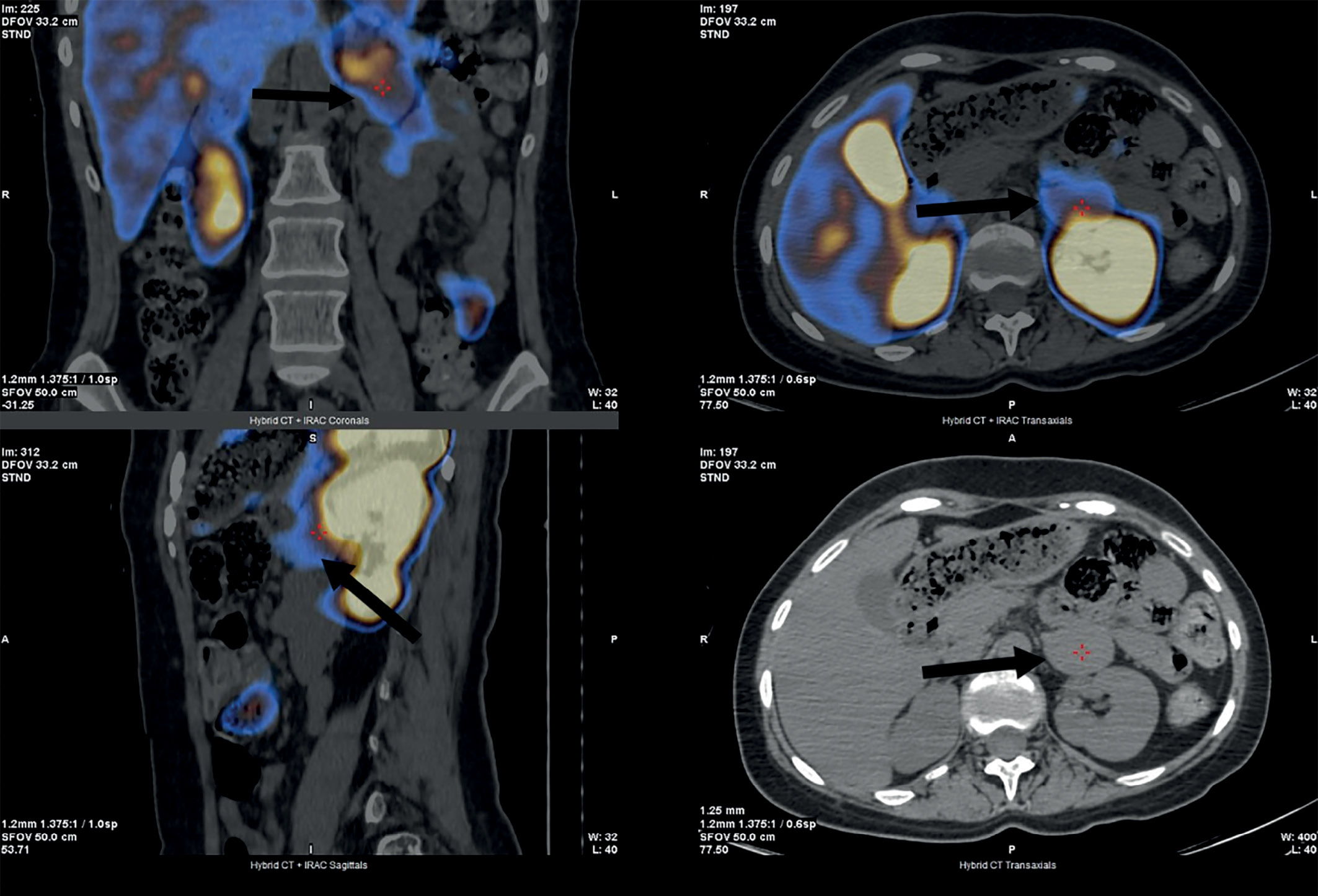 3. Рисунок 3. Соматостатин-рецепторная сцинтиграфия с Тс-99-Тектротидом в режиме «все тело», стрелочками указано новообразование левого надпочечника.