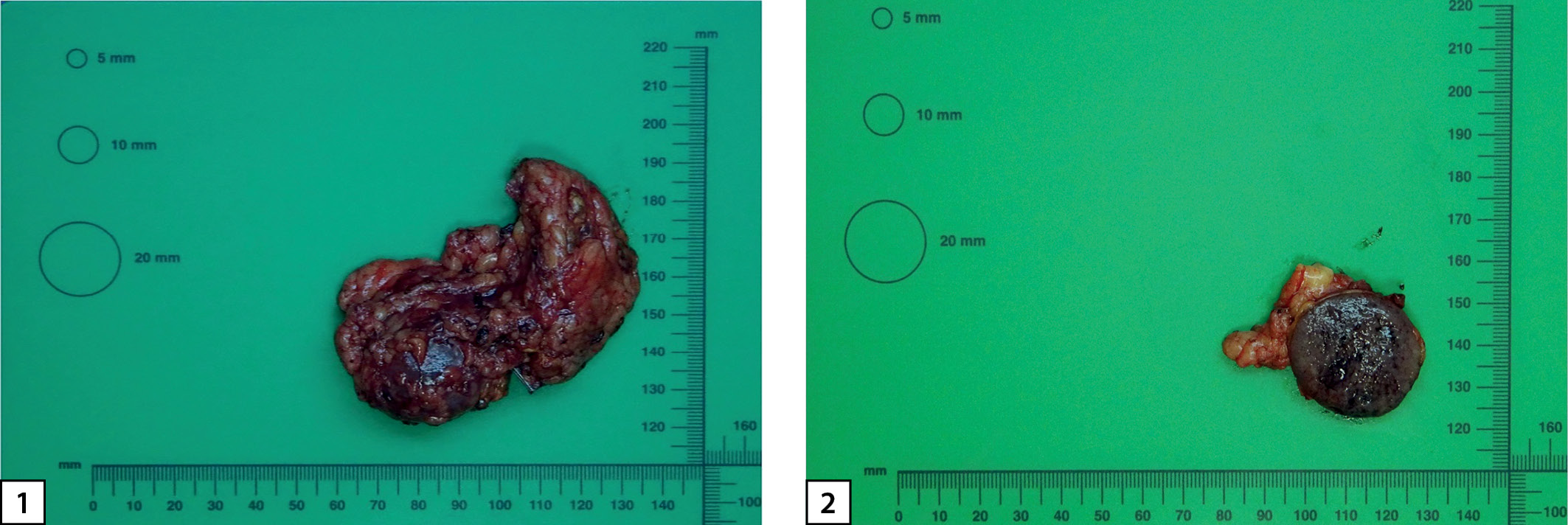 4. Рисунок 4. Макропрепарат левого надпочечника с опухолью: 1 — макровид левого надпочечника с опухолью, 2 — макровид левого надпочечника с опухолью на разрезе
