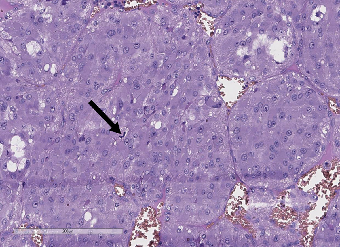 5. Рисунок 5. Гистологическое строение феохромоцитомы левого надпочечника (стрелкой показан митоз), гематоксилин-эозин, 200х.