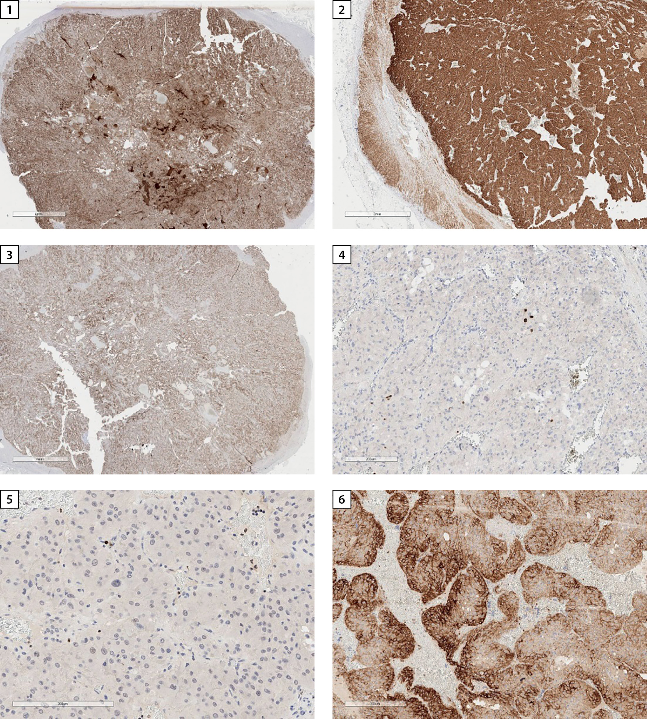 6. Рисунок 6. Иммуногистохимическое исследование: 1 — диффузная экспрессия хромогранина А, 4х; 2 — диффузная экспрессия синаптофизина, 2х; 3 — экспрессия АКТГ, 4х; 4 — уровень пролиферативной активности по экспрессии Ki67 составляет до 5%, 200х; 5 — при определении митотической активности с фосфогистоном определяется 4 митоза на 50 радиусе поля зрения (РПЗ), 200х; 6 — экспрессия рецепторов соматостатина 2А типа (SSTR 2A) — 2 балла, 300х.