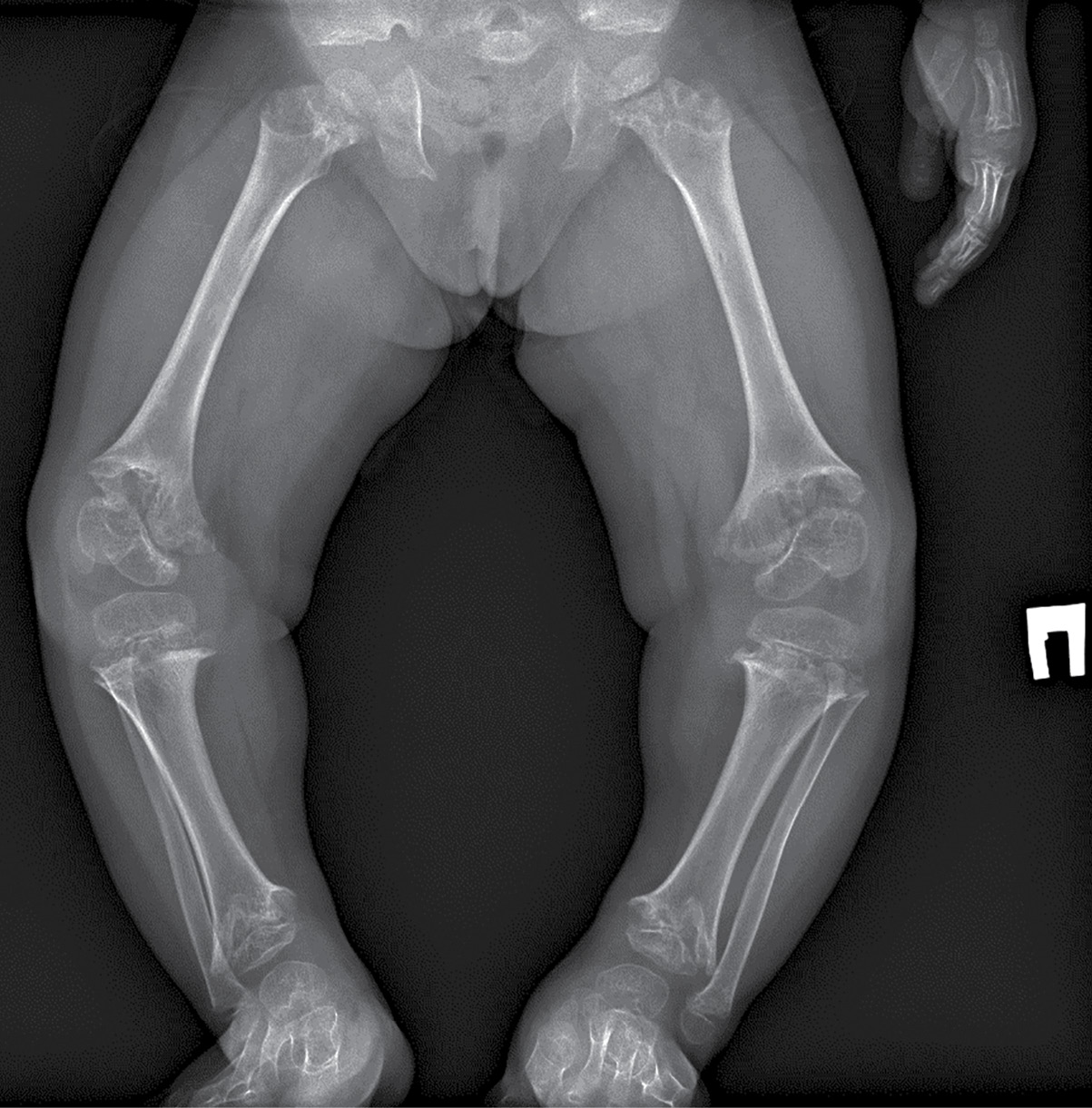 В биохимическом анализе крови клинически значимых изменений нет: кальций общий — 2,49 ммоль/л, кальций ионизированный — 1,28 ммоль/л, фосфор неорганический — 1,89 ммоль/л. В гормональном профиле уровень ИФР-1 соответствует возрастной норме — 81,7 нг/л (18,2–172,0). По данным рентгенографии нижних конечностей, в прямой проекции выявлена выраженная варусная деформация коленных суставов. Метаэпифизы всех костей, образующих правый и левый коленные суставы, расширены, вздуты. Соотношения в суставах неправильные (больше — в правом суставе). Суставные поверхности неровные, нечеткие, суставные щели неравномерные, расширены (рис. 1–2).