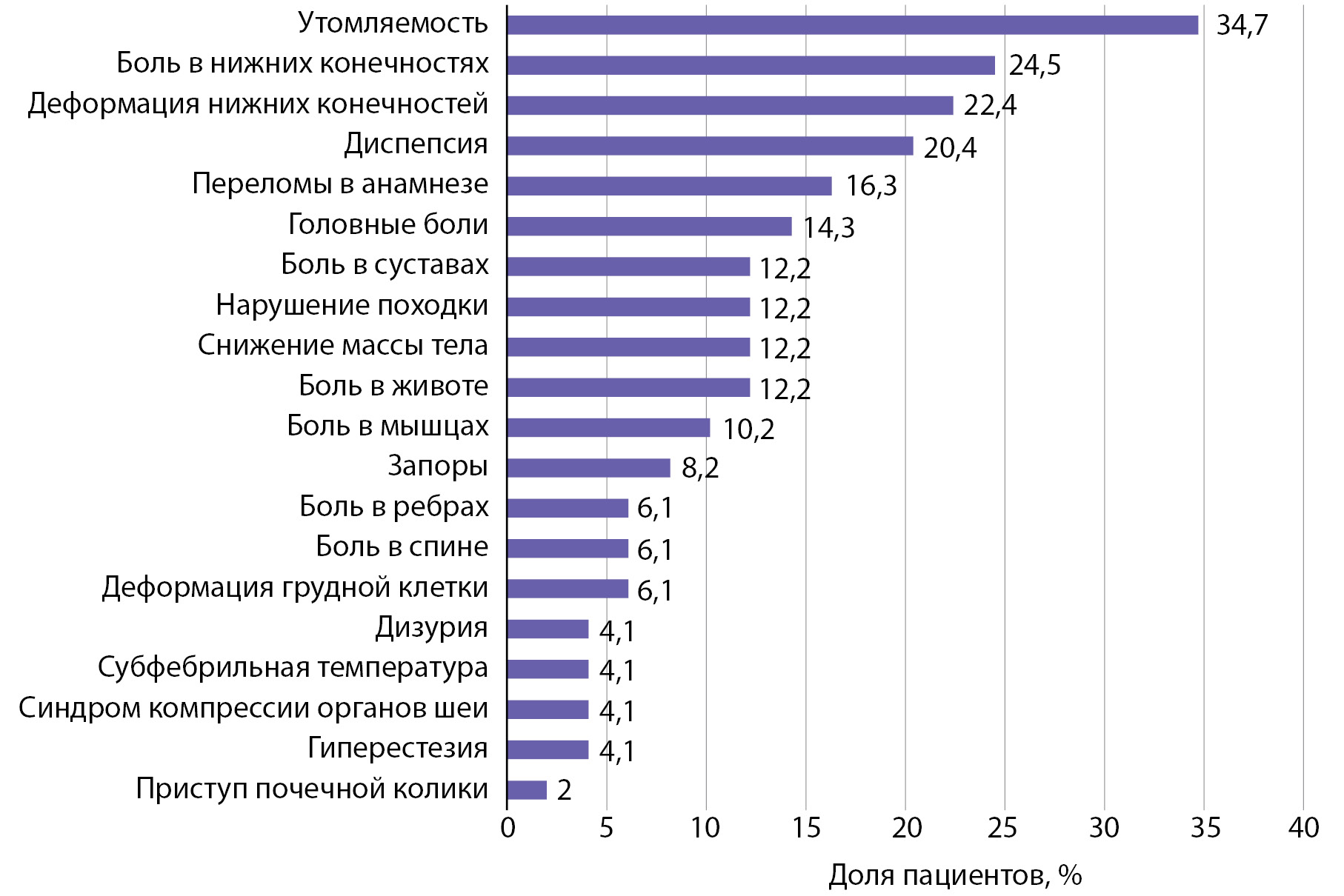 В исследование включено 49 пациентов (23 мальчика, 26 девочек) с ПГПТ, обследованных в период с сентября 2014-го по декабрь 2022 г. Возраст проявления первых симптомов ПГПТ составил 13,8 года [ 10,6; 15,2]. Медиана возраста установки диагноза ПГПТ составила 15,8 года [ 13,1; 16,8]. Наиболее частыми клиническими симптомами при постановке диагноза были утомляемость, головные боли, диспепсия, боли в нижних конечностях, 16,3% пациентов имели в анамнезе переломы (рис. 1). У 12 детей (24,5%) жалоб на момент постановки диагноза не отмечалось, и основанием для обследования 3 из них был отягощенный семейный анамнез по МЭН1, у 5 — выявленное в ходе УЗИ по месту жительства образование щитовидной железы, у 3 — случайно выявленная гиперкальциемия и у 1 — гиперкальциурия.