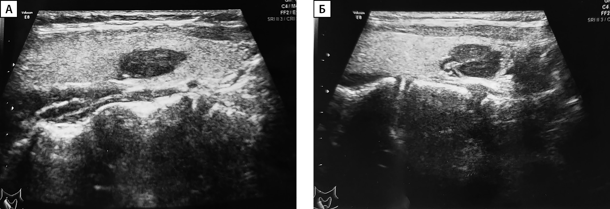 2. Рисунок 2 (А, Б). Ультразвуковое исследование аденом околощитовидных желез, эктопированных в ткань щитовидной железы. А — пациент №1; Б — пациент №5.